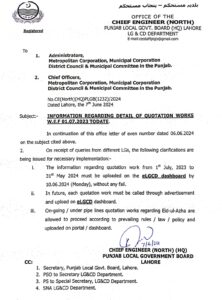 عیدالاضحیٰ کے حوالے سے جاری/انڈر پائپ لائنز کوٹیشن کے کاموں کو مروجہ قواعد/قانون/پالیسی کے مطابق آگے بڑھنے کی اجازت ہے اور پورٹل/ڈیش بورڈ پر اپ لوڈ کر دی گئی ہے۔