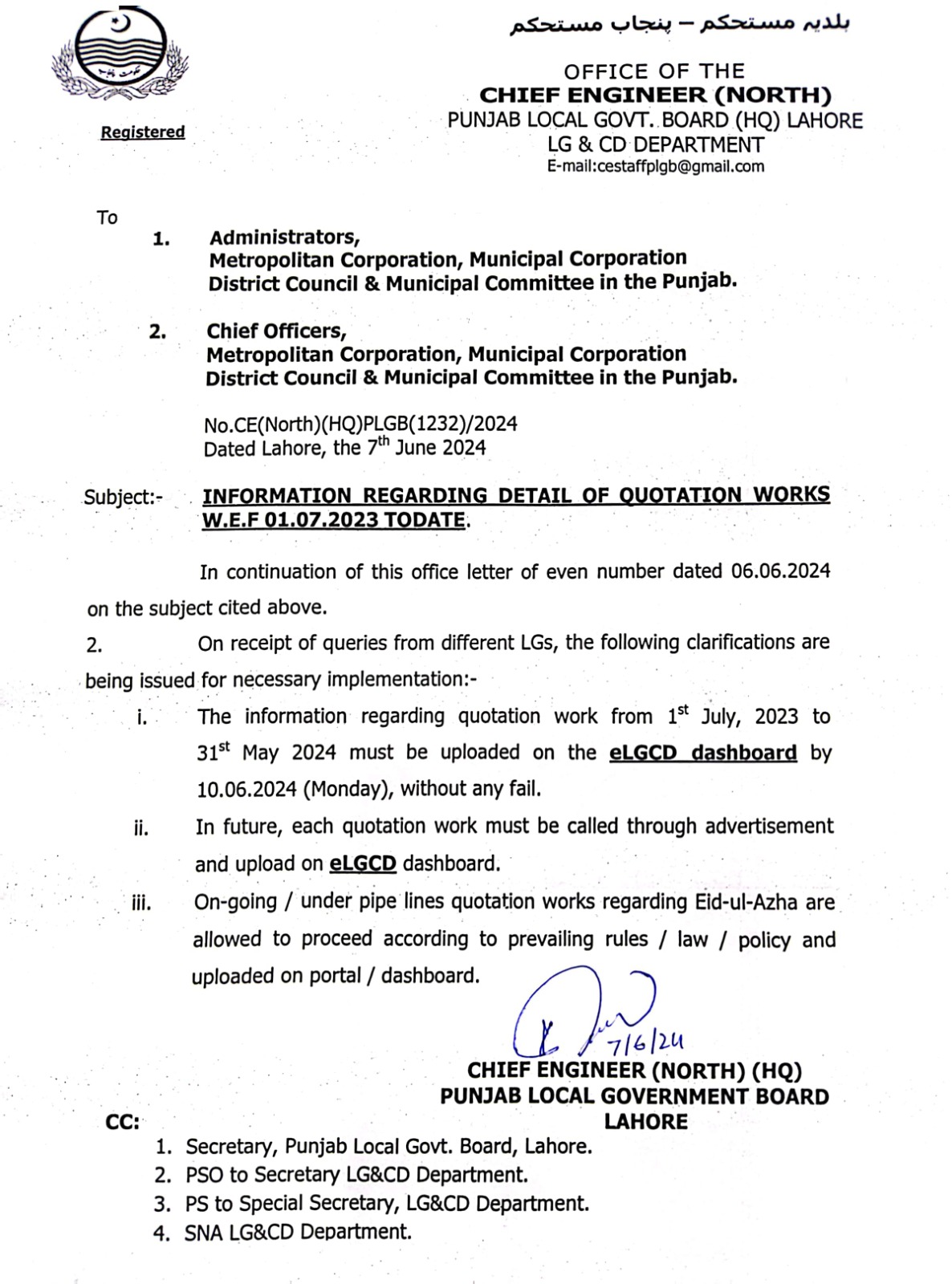 نمبر CE(نارتھ)(HQ)PLGB(1232)/2024 مورخہ لاہور، 7 جون 2024