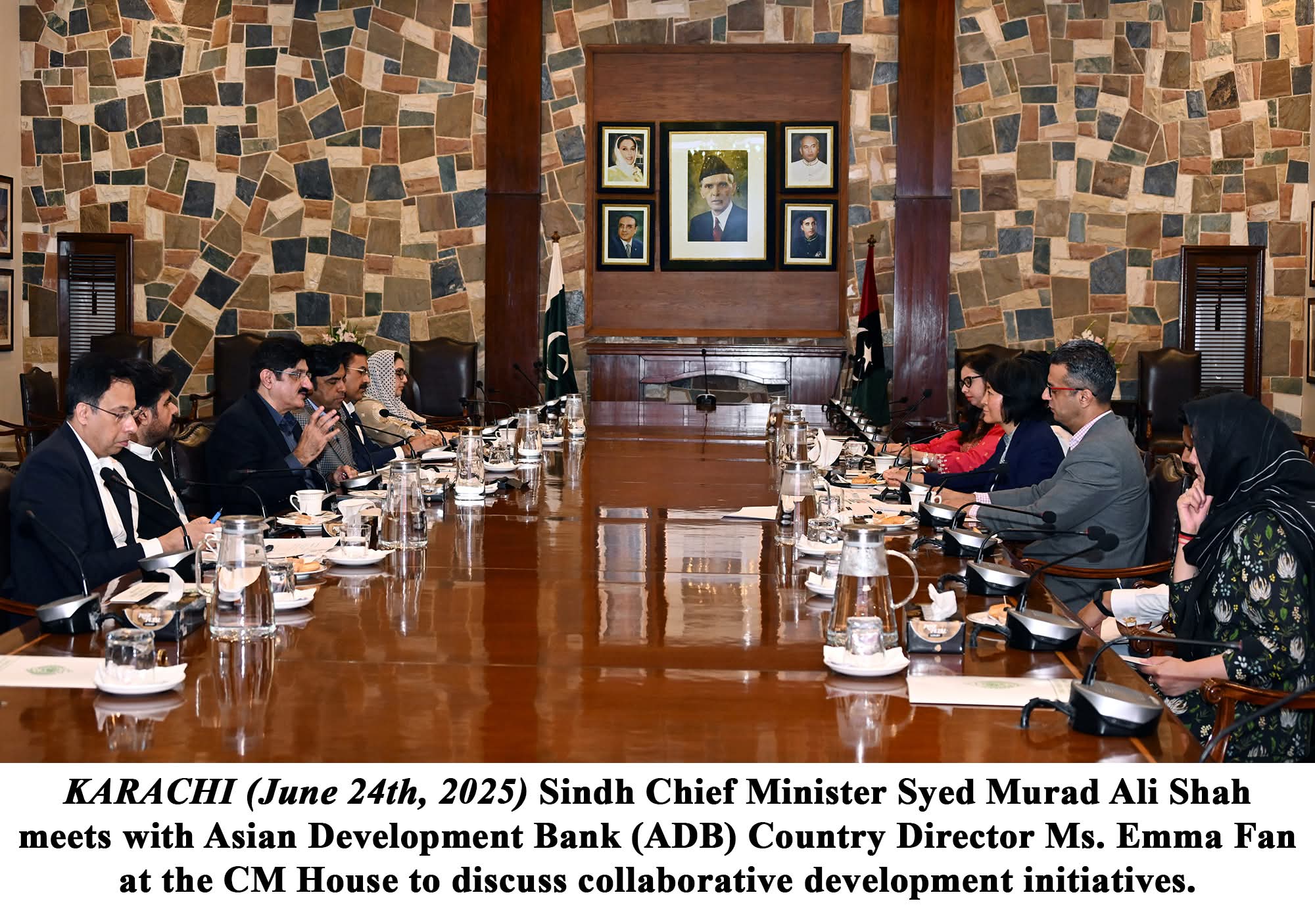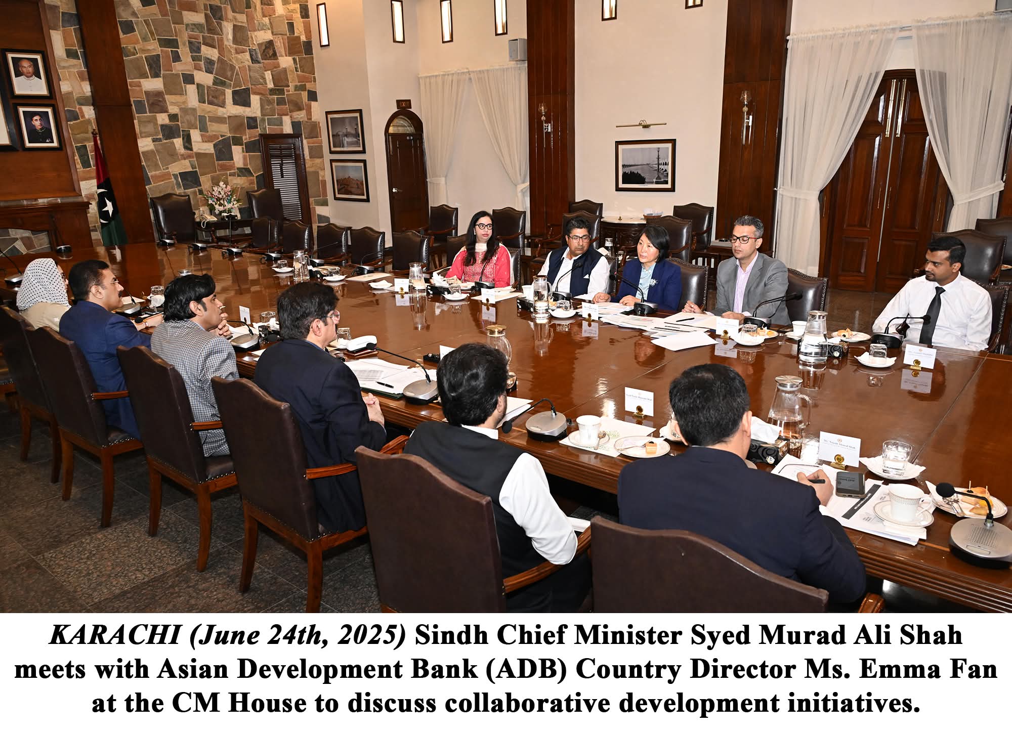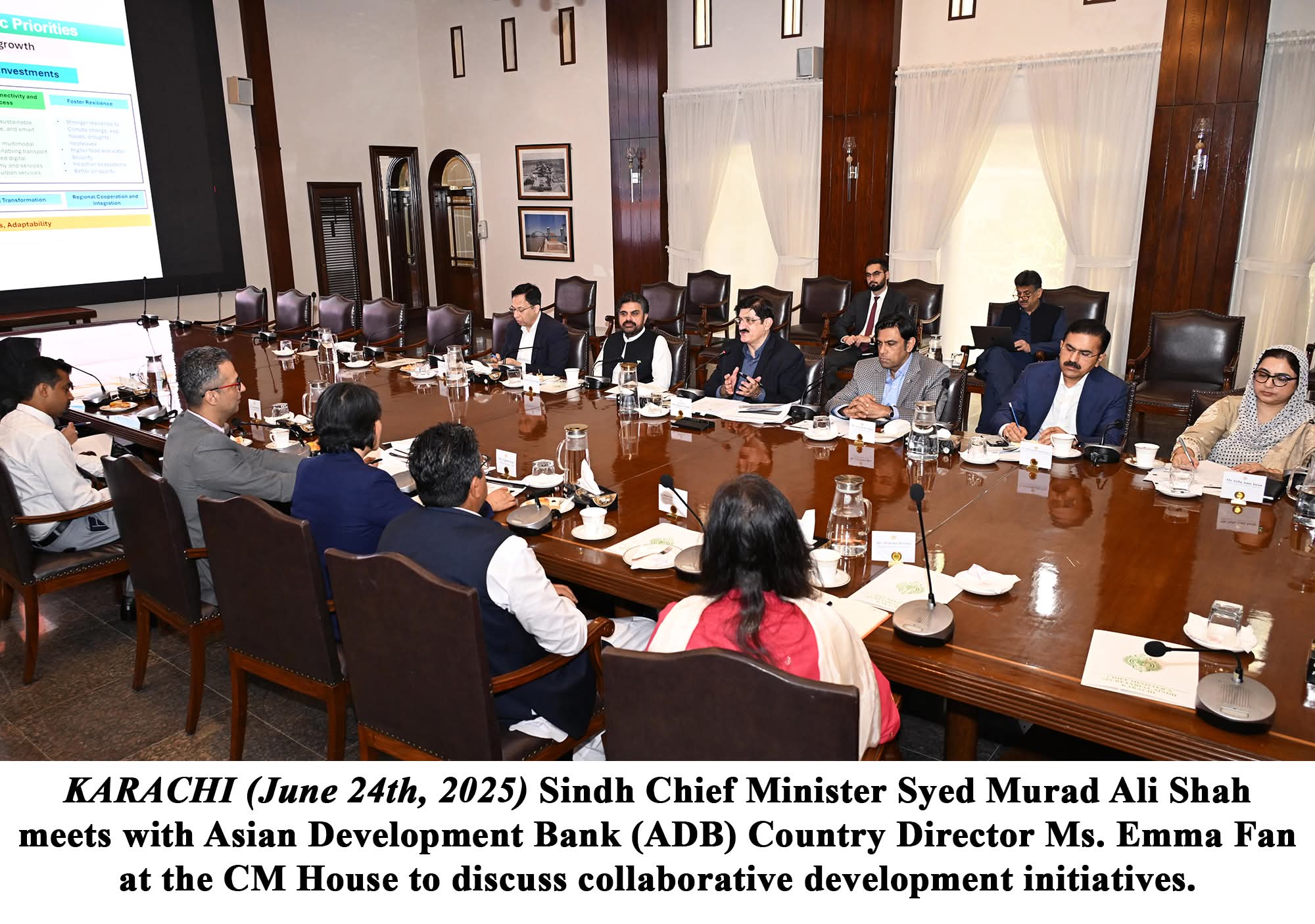 Sindh Chief Minister Syed Murad Ali Shah held a high-level meeting with the Asian Development Bank (ADB) Country Director Ms Emma Fun and agreed to collaborate on advancing key development projects in Sindh, including the Treatment (TP-4) initiative aimed at improving water quality and expanding infrastructure in both rural and urban areas.