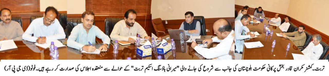 کمشنر مکران قادر بخش پرکانی کی زیر صدارت میرانی ہاؤسنگ اسکیم تربت کے حوالے سے ایک اجلاس منعقد ہوا۔ اجلاس کا مقصد اسکیم کے جاری ترقیاتی کاموں، درپیش مسائل، اور آئندہ کے لائحہ عمل پر تفصیلی غور و خوض کرنا تھا اجلاس میں ایڈیشنل کمشنر مکران ظفر علی بلوچ، ڈویژنل ڈائریکٹر ڈویلپمنٹ خالد حسین، ڈپٹی پی ڈی میرانی ہاؤسنگ اسکیم رؤف عمر، ڈپٹی پی ڈی تربت سٹی ڈویلپمنٹ پروجیکٹ بہرام گچکی، ایکسیئن بی اینڈ آر (روڈ) گل محمد بلوچ، ایکسیئن بی اینڈ آر (بلڈنگ) مجیب الرحمن رند، سینئر اسسٹنٹ ڈائریکٹر لوکل گورنمنٹ زاہد عمر بلوچ اور کنسلٹنٹ گروپ CG کے نمائندے حمزہ بلوچ شریک ہوئے اجلاس میں میرانی ہاؤسنگ اسکیم کے ترقیاتی امور، مالی و تکنیکی چیلنجز، سیکیورٹی خدشات، انجینئرز اور ٹھیکیداروں کی کارکردگی سمیت تمام پہلوؤں کا تفصیلی جائزہ لیا گیا۔ کمشنر مکران نے اظہارِ خیال کرتے ہوئے کہا کہ