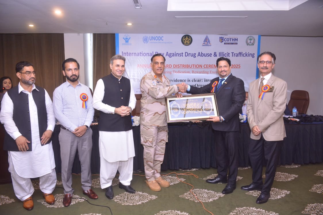منشیات کے خلاف عالمی دن کی مناسبت سے ڈرگ ایڈوائزری ٹریننگ حب گفٹ یونیورسٹی کے اشتراک سے سالانہ ایوارڈ کی تقریب کا اہتمام کیا جسکے مہمان خصوصی بریگیڈیئر سکندر حیات چوہدری کمانڈر اینٹی نارکوٹکس فورس پنجاب تھے تقریب کی صدارت اعزازی کونسل جنرل سری لنکا سری لنکا جنرل یاسین جوائیہ نے کی، دیگر مہمانوں میں چیف آپریٹنگ آفیسر محمد حنیف گل، نائب صدر لاہور پریس کلب صائمہ نواز، سربراہ گفٹ یونیورسٹی انوار ڈار، اسٹنٹ ڈائریکٹر ایف آئی اے سید زین العابدین، ایس پی ظفر عباس نقوی تھے۔کنسلٹنٹ انسداد منشیات مہم سید ذوالفقار حسین نے منشیات کے خلاف ابتک کیے جانے والے اقدامات بارے آگاہ کیا۔ بریگیڈیئر سکندر حیات نے کہا کہ منشیات بڑا مسلئہ ہے سب کو مل کر کام کرنا ہوگا۔ اے این ایف پنجاب اپنے محدود وسائل کے باوجود منشیات کی بڑی مقدار کو پکڑتی ہے۔ اعزازی کونسل جنرل یاسین جوائیہ نے کہا کہ والدین اساتذہ بچوں کی تربیت کریں اچھے اور برے کے بارے آگاہ کریں، بچے نشہ کی طرف کیوں آتے ہیں۔ ہمیں اسکے متعلق سوچنا ہو گا۔حنیف گل نے کہا کہ تعلیمی اداروں میں منشیات کے خلاف پالیسی کی اشد ضرورت ہے۔سید ذوالفقار حسین کنسلٹنٹ انسداد منشیات مہم نے کہا کہ نوجوانوں کو منشیات پر لگانے اور فروخت کرنے والے کسی رعایت کے مستحق نہیں ہیں۔اس دن کے منانے کا مقصد منشیات کے متعلق لوگوں میں آگاہی پیدا کرنا، علاج معالجہ کی سہولیات کا جائزہ لینا اور عادی افراد کو ہسپتالوں تک رسائی کے علاوہ منشیات کی سپلائی کو ملکی اور بین الاقوامی سطح پر روکنا شامل ہیں۔ تقریب کے اختتام پر مختلف شعبوں سے تعلق رکھنے والے افراد کو ایوارڈز سے نوازا گیا،