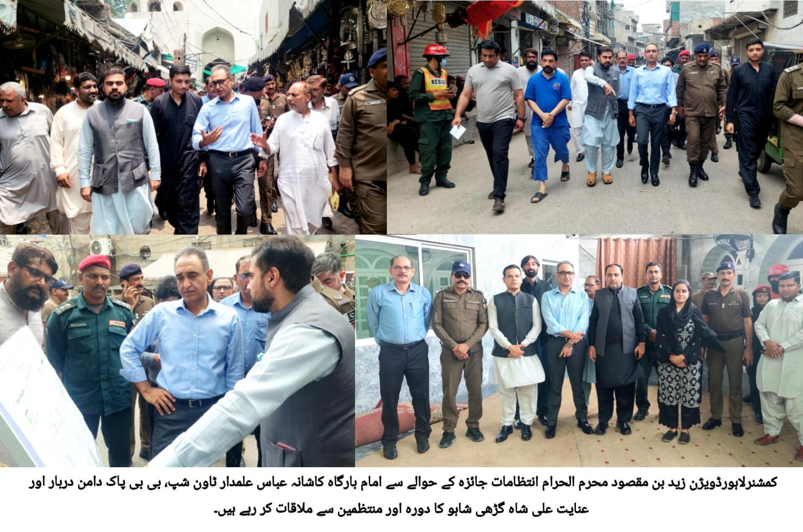 وزیر اعلیٰ پنجاب کی خصوصی ہدایت پر مرکزی امام بارگاہوں کے دورے اور منتظمین سے ملاقات کا سلسلہ جاری ہے۔ کمشنر لاہور زید بن مقصود نے محرم الحرام انتظامات جائزہ کے حوالے سے بی بی پاک دامن دربار، امام بارگاہ عنایت علی شاہ گڑھی شاہو اور امام بارگاہ کاشانہ عباس علمدار ٹاون شپ کا دورہ کیا۔ کمشنر لاہور نے تمام متعلقہ انتظامی افسران کے ہمراہ امام بارگاہوں میں ضلعی انتظامیہ کی جانب سے کیے گئے اقدامات کا جائزہ لیا۔ اس موقع پر اے سی شالامار و ایس پی پولیس نے انتظامات بارے بریفنگ دیتے ہوئے کہا کہ امام بارگاہوں اور جلوس روٹس کی مانیٹرنگ، ریسکیو، میڈیکل کور، سکیورٹی، لائٹنگ اور نکاسی آب انتظامات مکمل ہیں، امام بارگاہوں کے منتظمین سے مکمل رابطہ میں ہیں۔