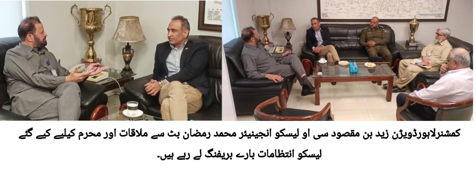 کمشنر لاہور زید بن مقصود کی محرم مانیٹرنگ و انتظامات جائزہ کے حوالے سے لیسکو ہیڈ آفس آمد۔ سی او لیسکو انجینیئر محمد رمضان بٹ نے کمشنر لاہور کو خوش آمدید کہا۔ کمشنر لاہور نے محرم الحرام میں لیسکو کی جانب سے کیے گئے انتظامات کا جائزہ لیا۔ سی او لیسکو انجینیئر محمد رمضان بٹ نے محرم انتظامات و لیسکو کے جاری آپریشنز بارے بریفنگ دیتے ہوئے کہا ہے کہ ہر مرکزی جلوس کے ہمراہ ایس ای لیسکو اپنی ٹیم کے ساتھ خود موجود ہوگا، سہولیات کی فراہمی پر کوئی کمپرومائز نہیں، انہوں نے کہا کہ جلوس کے دوران بارش کیصورت میں الیکٹریفکیشن سے بچاو کیلئے لیسکو ٹیمز ایڈوانس پارٹی میں موجود ہونگی، سی او لیسکو نے کہا کہ لیسکو مرکزی کنڑول آفس سے محرم کیلئے لیسکو ٹیموں کی مانیٹرنگ و کنٹرولنگ جاری ہے، لیسکو بجلی چوری کیخلاف ایکشنز کیلئے ضلع و سب ڈویژنز سطح پر کام کررہا ہے۔کمشنر لاہور زید مقصود نے لیسکو انتظامیہ کو ہدایت دیتے ہوئے کہا ہے کہ 9,8 اور 10 محرم کے جلوسوں و مجالس کے اوقات کے مطابق بجلی ترسیلی و حفاظتی میکانزم کو فعال رکھا جائے، انہوں نے کہا کہ محرم جلوس کے دوران بجلی کی بلا تعطل ترسیل کیلئے بی پلان بیک اپ ناگزیر ہے فوری ریسپانس ضروری ہے، بارش کے دنوں میں بجلی کی تاروں کے گرنے یا کھمبوں میں کرنٹ آنے والے ایریاز کو پیشگی مانیٹر کرائیں۔ کمشنر لاہور نے کہا کہ محرم کے مرکزی جلوسوں کے گرد واسا کی انسٹالیںشنز کو بھی لوڈشیڈنگ سے مبراء رکھا جائے گا۔کمشنر لاہور نے مزید کہا کہ لیسکو کو تمام آپریشنز میں ضلعی انتظامیہ کی سپورٹ ہوگی۔ بجلی چوری قومی خزانے کا نقصان ہے اس کے خلاف بھرپور ایکشن ضروری ہے۔بریفنگ اجلاس میں چیف انجینیر آپریشنز لیسکو ندیم ملک، آپریشنز ڈائریکٹر اعجاز بھٹی، چیف انجینیر ڈویلپمنٹ عمران محمود بھی شریک تھے۔
