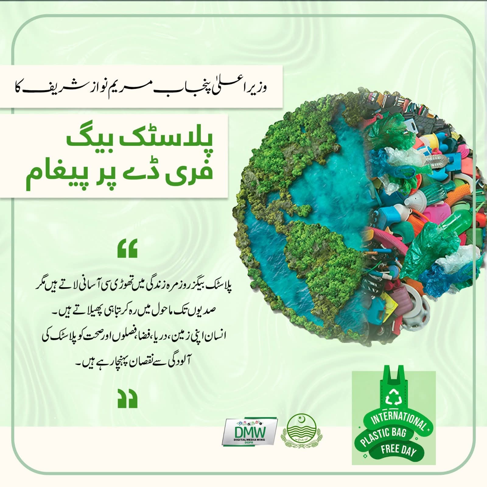 وزیراعلیٰ پنجاب مریم نواز شریف نے کہا ہے کہ الحمد للہ پنجاب روز بروز پلاسٹک فری ہونے کی طرف بڑھ رہا ہے۔ پلاسٹک بیگز کی جگہ ماحول دوست کپڑے اور کاغذ کی تھیلیوں کے استعمال کو فروغ دیا جارہا ہے۔ وزیر اعلیٰ پنجاب مریم نواز شریف نے پلاسٹک بیگ فری ڈے پر اپنے پیغام میں کہا کہ پلاسٹک بیگز روزمرہ زندگی میں تھوڑی سی آسانی لاتے ہیں مگر صدیوں تک ماحول میں رہ کر تباہی پھیلاتے ہیں۔ انسان اپنی زمین، دریا، فضا، فصلوں اور صحت کو پلاسٹک کی آلودگی سے نقصان پہنچا رہے ہیں۔ وزیراعلیٰ مریم نواز شریف نے کہا کہ پلاسٹک بیگز زمین کی زرخیزی ختم، نکاسی آب کے نظام بند اور آبی حیات کو ختم کرنے کا سبب بن سکتا ہے۔ پلاسٹک کا استعمال کینسر سمیت دیگر مہلک امراض کی وجہ بن سکتا ہے۔ وزیراعلیٰ مریم نواز شریف نے کہا کہ پلاسٹک بیگز کے خاتمے کے لئے مارکیٹوں اور فیکٹریوں میں ماحولیات کے قوانین پر عمل درآمد کا کلچر متعارف کرایا جا رہا ہے۔ سکولوں، کالجوں، اور کمیونٹیز میں پلاسٹک فری پنجاب کا شعور اور آگاہی کی مہم جاری ہیں۔ پنجاب میں ری سائیکلنگ کے دوست متبادل متعارف کرائے جارہے ہیں۔