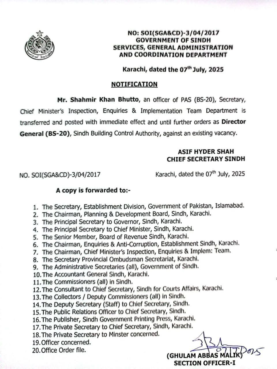 سیکرٹری وزیر اعلٰی معائنہ ٹیم شاہ میر خان بھٹو کو ڈائریکٹر جنرل سندھ بلڈنگ کنٹرول اتھارٹی تعینات کردیا گیا ہے۔چیف سیکرٹری سندھی آصف حیدر شاہ کی جانب سے نوٹیفکیشن جاری کر دیا گیا ہے۔