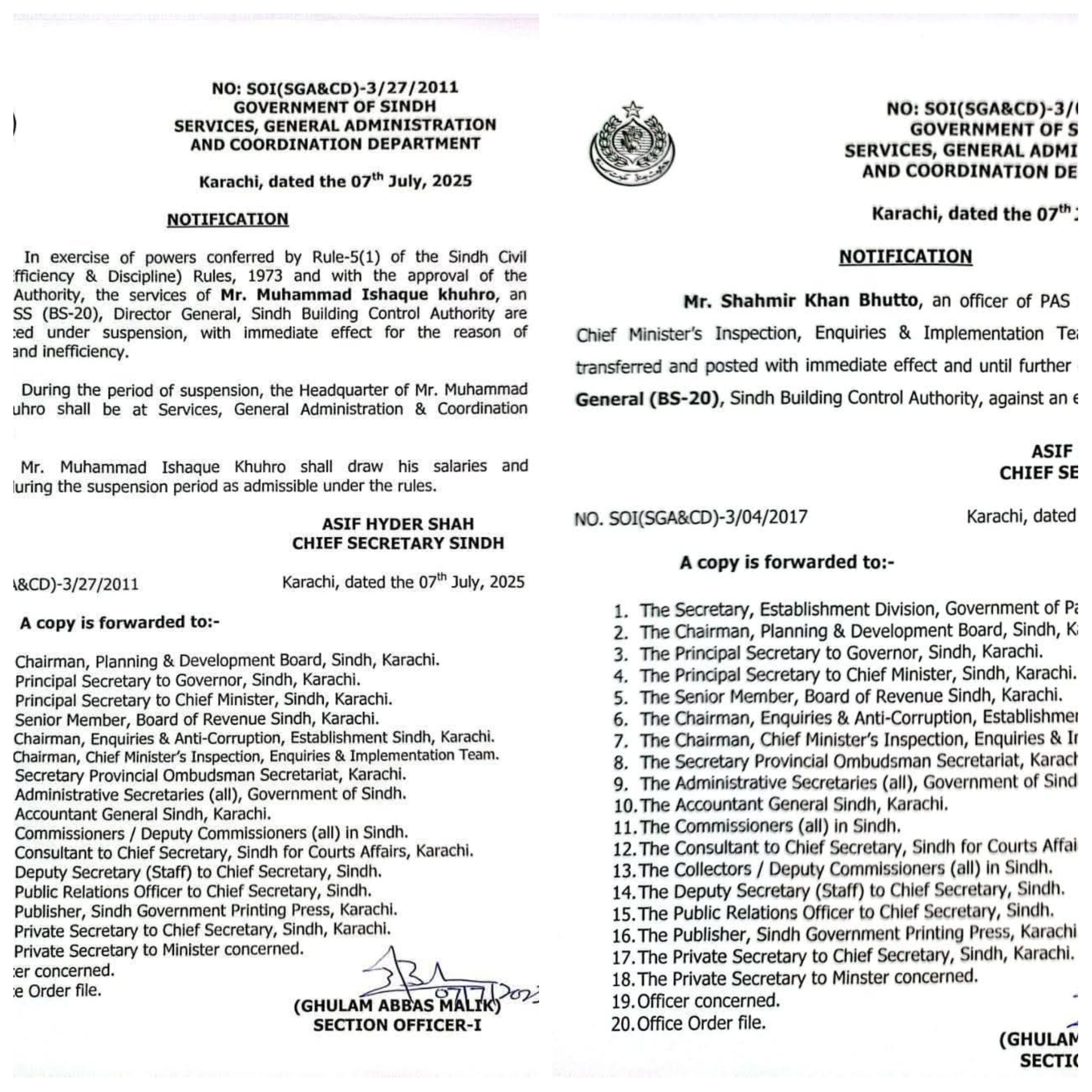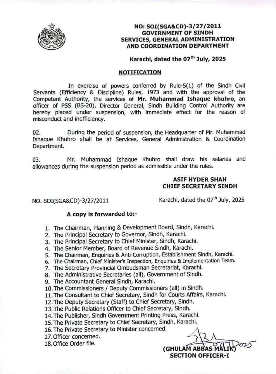 حکومت سندھ نے فرائض میں غفلت پر ڈائریکٹر جنرل سندھ بلڈنگ کنٹرول اتھارٹی محمد اسحاق کھوڑو کو معطل کر دیا ہے۔