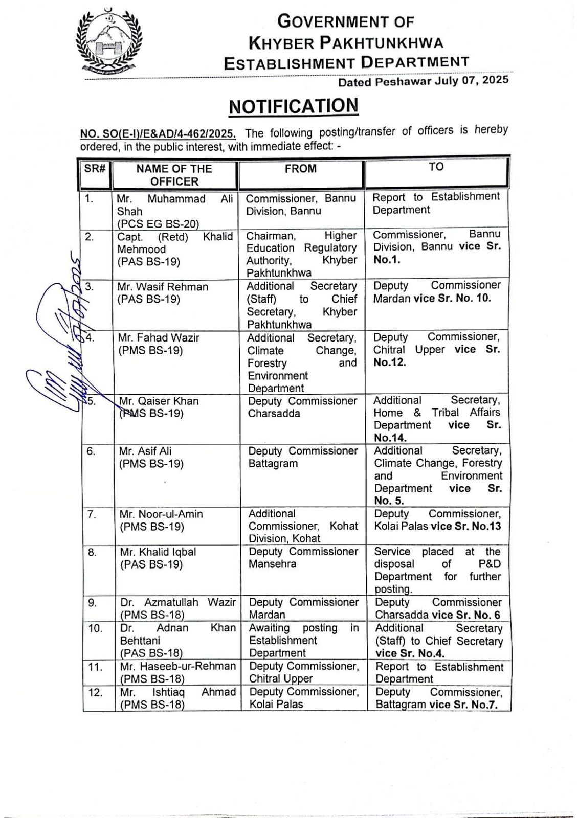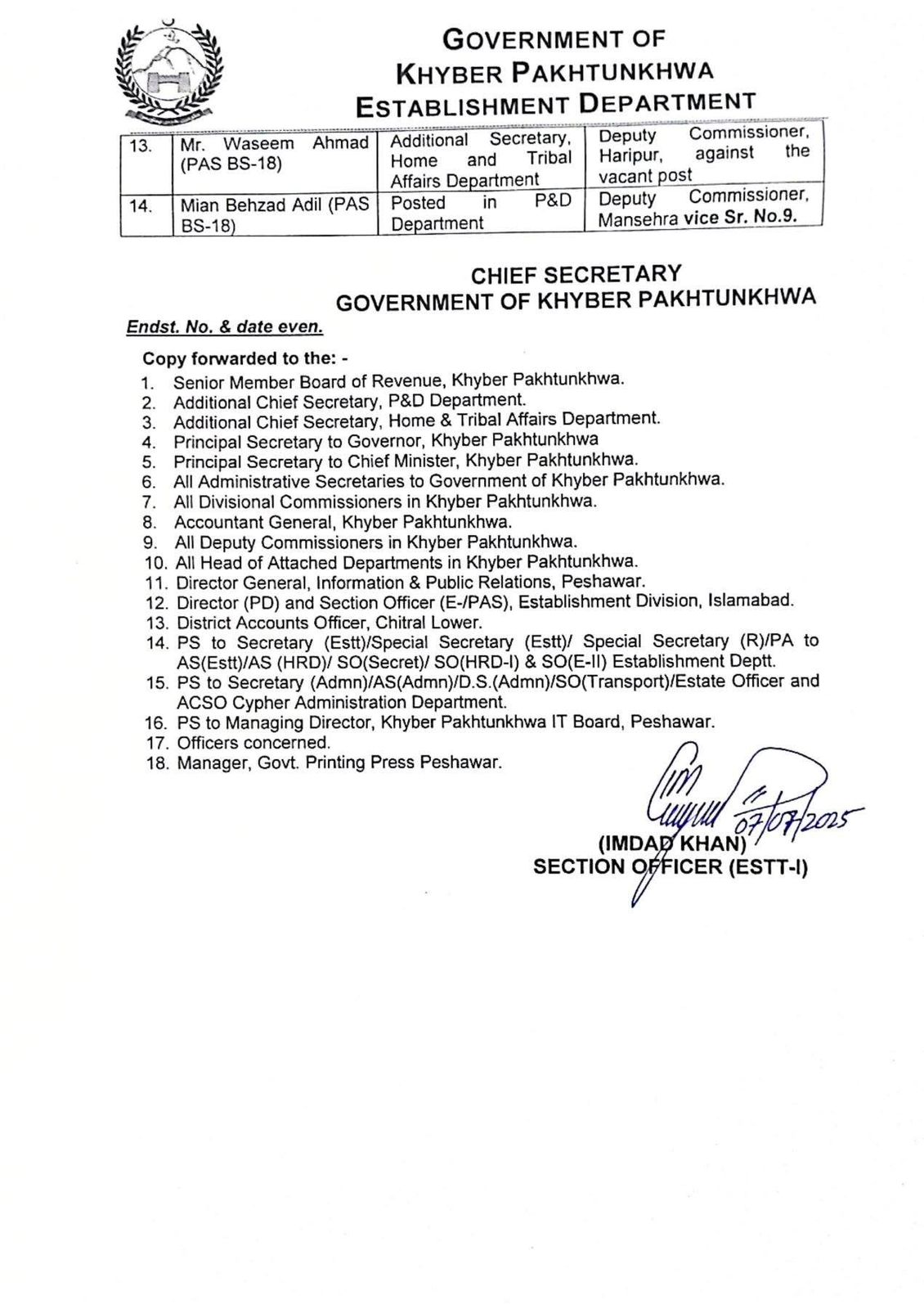 فہد وزیر ایڈیشنل سیکرٹری ماحولیات کو ڈپٹی کمشنر چترال، قیصر خان کو ڈپٹی کمشنر چارسدہ سے ایڈیشنل سیکرٹری ہوم، خالد اقبال ڈپٹی کمشنر مانسہرہ کی خدمات پی اینڈ ڈی کے سپرد کر دی گئی ہیں۔عظمت اللہ وزیر ڈی سی مردان کو ڈی سی چارسدہ، تقرری کے منتظر ڈاکٹر عدنان خان کو ایڈیشنل سیکرٹری ٹو چیف سیکرٹری، حبیب الرحمان ڈی سی چترال کو او ایس ڈی بنا دیا گیا ہے۔اشتیاق احمد ڈی سی کولائی پالس کو ڈی سی بٹگرام ،آصف علی ڈی سی بٹگرام کو ایڈیشنل سیکرٹری ماحولیات، وسیم احمد ایڈیشنل سیکرٹری ہوم کو ڈپٹی کمشنر ہری پور اورمیاں بہزاد عادل کو پی اینڈ ڈی سے ڈپٹی کمشنر مانسہرہ لگا دیا گیا ہے۔