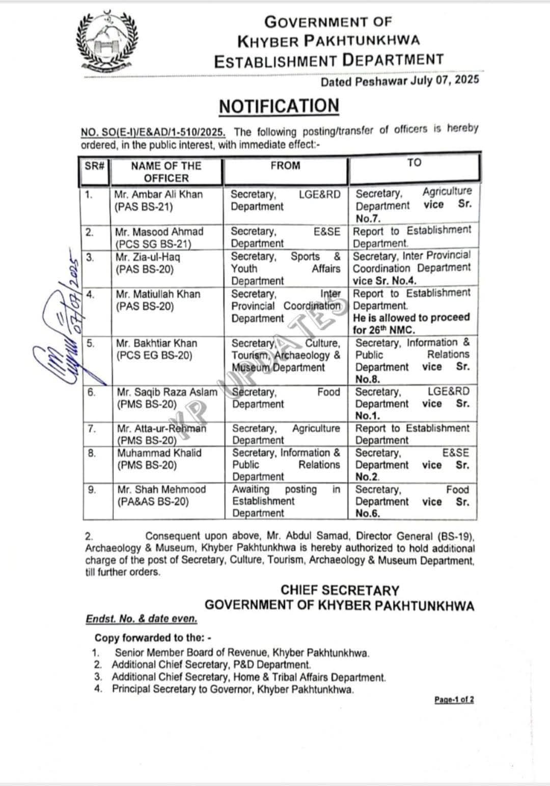 حکومت خیبر پختونخوا اسٹیبلشمنٹ ڈیپارٹمنٹ کی جانب سے جاری نوٹیفکیشنز کے مطابق سیکرٹری بلدیات عمبر علی خان کو تبدیل کر کے سیکرٹری زراعت لگا دیا گیا ہے۔سیکرٹری فوڈ ثاقب رضا اسلم کو سیکرٹری لوکل گورنمنٹ تعینات کیا گیا ہے۔مسعود احمد سیکرٹری ای اینڈ ایس ای کو اسٹیبلشمنٹ ڈیپارٹمنٹ رپورٹ کرنے کی ہدایت کی گئی ہے۔ضیاء الحق سیکرٹری سپورٹس اینڈ یوتھ افئیرز کو سیکرٹری انٹر پراونشل ڈیپارٹمنٹ، بختیار خان سیکرٹری کلچر ،ٹورازم، آرکیالوجی کو اسٹیبلشمنٹ ڈیپارٹمنٹ رپورٹ کرنے کی ہدایت کی گئی ہے۔عبدالرحمان سیکرٹری زراعت کو بھی اسٹیبلشمنٹ رپورٹ، محمد خالد سیکرٹری انفارمیشن کو سیکرٹری ای اینڈ ایس ای جبکہ تقرری کے منتظر شاہ محمود کو سیکرٹری فوڈ تعینات کردیا گیا ہے۔محمد علی شاہ کمشنر بنوں کو او ایس ڈی بنا دیا گیا ہے۔کیپٹن ریٹائرڈ خالد محمود چیئرمین ہائیر ایجوکیشن ریگولیٹری اتھارٹی کو کمشنر بنوں تعینات کیا گیا ہے۔واصف رحمان ایڈیشنل سیکرٹری چیف سیکرٹری آفس کو ڈپٹی کمشنر مردان لگایا گیا ہے۔