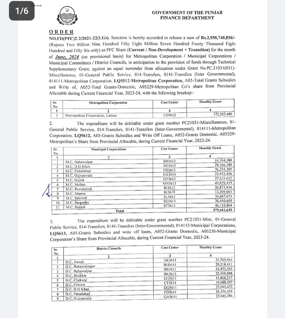 لاہور(بلدیات ٹائمز رپورٹ)پنجاب کے 229 بلدیاتی اداروں کو رواں مالی سال کا آخری پی ایف سی شیئر جاری کر دیا گیا ہے۔محکمہ خزانہ پنجاب نے2 ارب 95 کروڑ 87 لاکھ روپے کا ماہانہ کرنٹ پی ایف سی شیئر جاری کیا ہے ۔یہ شیئر جون کا ریلیز کیا گیا ہے۔محکمہ خزانہ پنجاب کی طرف سے جاری کردہ نوٹیفکیشن کے مطابق میٹروپولیٹن کارپوریشن لاہور کو 17 کروڑ 22 لاکھ 62 ہزار روپے جاری کئے گئے ہیں۔پنجاب کی 35 ضلع کونسلوں کو مجموعی طور پر ایک ارب 23 لاکھ روپے کا کرنٹ پی ایف سی شیئر ٹرانسفر کیا گیا ہے جبکہ 182 میونسپل کمیٹیوں کے لئے ایک ارب 39 کروڑ 47 لاکھ روپے جاری ہوئے ہیں۔صوبائی مالیاتی کمیشن آیوارڈ کے تحت 11 میونسپل کارپوریشنز کو 37 کروڑ 94 لاکھ 41 ہزار روپے کا اجراء کیا گیا ہے ۔ان میں میونسپل کارپوریشن بہاولپور کو ایک کروڑ 41 لاکھ 64 ہزار روپے ڈی جی خان 2 کروڑ 82 لاکھ 66 ہزار روپے فیصل آباد 7 کروڑ 62 لاکھ 55 ہزار روپے گجرات 2 کروڑ 76 لاکھ 35 ہزار روپے گوجرانوالہ 2 کروڑ 59 لاکھ 53 ہزار روپے مری ایک کروڑ 32 لاکھ روپے ملتان 4 کروڑ 98 لاکھ 39 ہزار روپے راولپنڈی 2 کروڑ 68 لاکھ 73 ہزار روپے ساہیوال 3 کروڑ 46 لاکھ روپے سرگودھا 3 کروڑ 64 لاکھ روپے اور میونسپل کارپوریشن سیالکوٹ کے لئے 4 کروڑ 61 لاکھ روپے کی گرانٹ جاری ہوئی ہے۔صوبائی مالیاتی کمیشن آیوارڈ کے تحت جاری کردہ کرنٹ شیئر ڈویلپمنٹ کے لئے استعمال نہیں ہو سکے گا۔