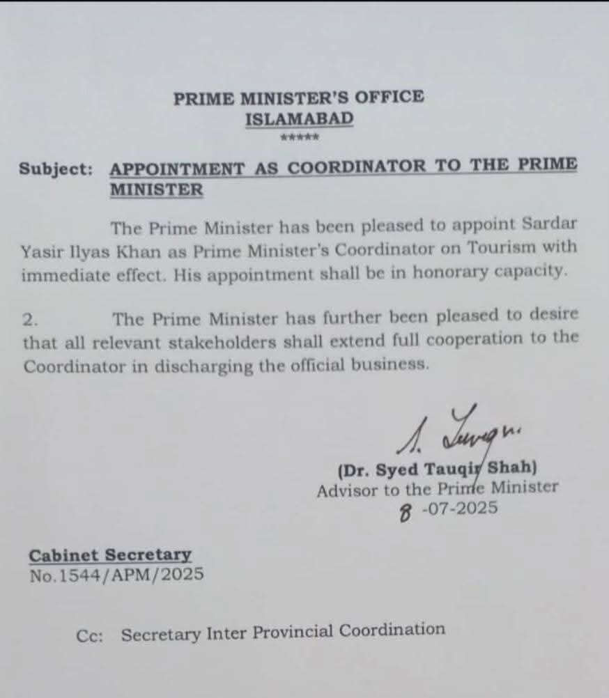 سردار یاسر الیاس خان کو وزیراعظم پاکستان کا اعزازی کوارڈینیٹر مقرر کر دیا گیا ہے۔وہ حال ہی میں مسلم لیگ ن میں شامل ہوئے تھے۔وزیر اعظم پاکستان میاں محمد شہباز شریف کے ایڈوائزر ڈاکٹر سید توقیر شاہ نے باقاعدہ نوٹیفیکشن جاری کر دیا ہے۔