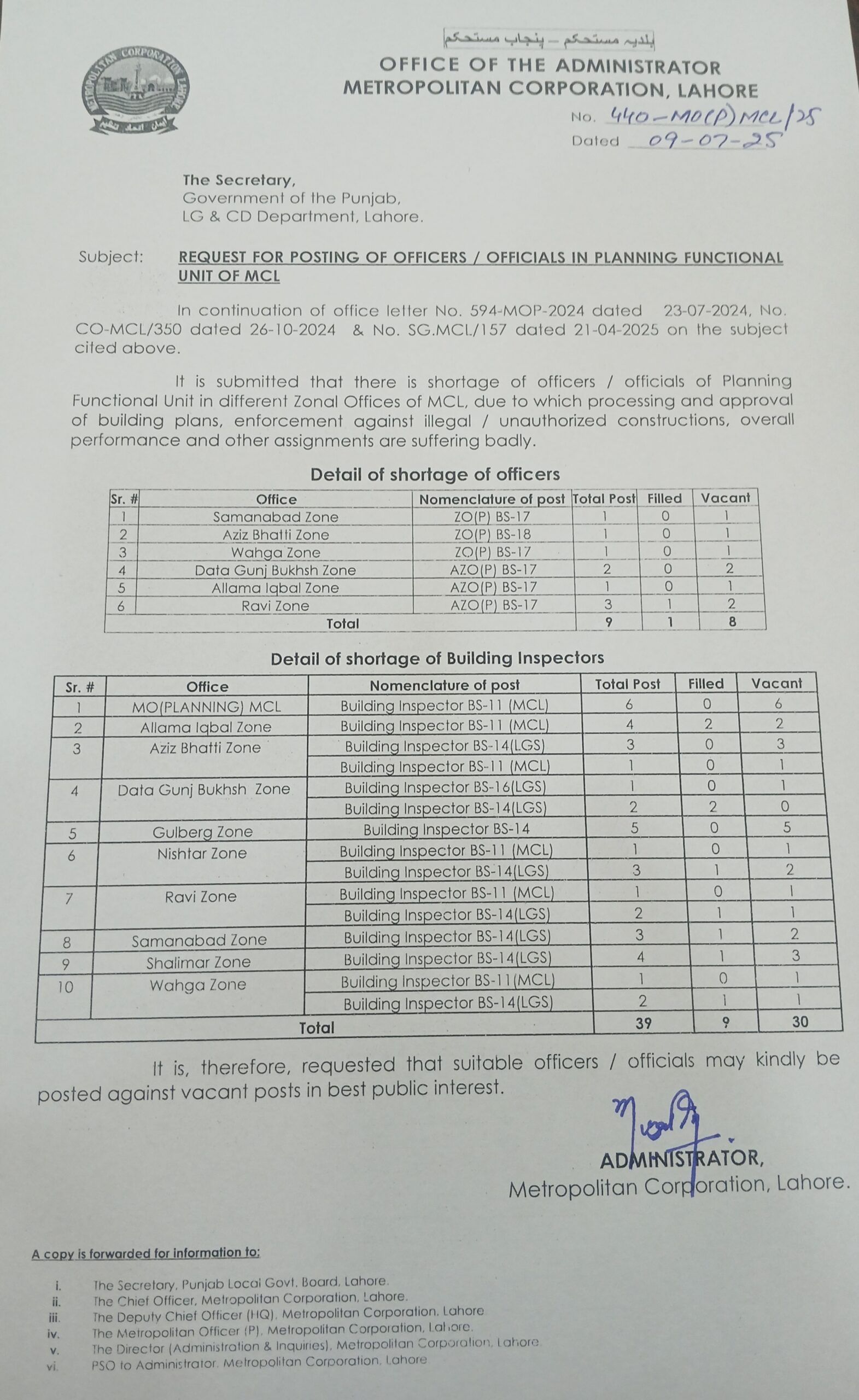 بلدیہ عظمٰی لاہور نے شعبہ پلاننگ میں افسران اور بلڈنگ انسپکٹرز کی ریکارڈ کمی محکمہ بلدیات سے رجوع کر لیا ہے۔محکمہ بلدیات پنجاب کو ایڈمنسٹریٹر ایم سی ایل کی طرف سے ملنے والی درخواست کے مطابق میٹروپولیٹن کارپوریشن لاہور کے نو زونز میں 8 افسران اور 30 بلڈنگ انسپکٹرز کی کمی اور سیٹیں خالی ہیں۔افسران اور بلڈنگ انسپکٹرز کی عدم دستیابی اور تقرریاں نہ ہونے سے میٹروپولیٹن کارپوریشن لاہور کو جہاں انفورسمنٹ، غیر قانونی تعمیرات و سرگرمیوں کے خلاف آپریشن متاثر ہو رہا ہے وہاں شہریوں کو بھی رہائشی و کمرشل نقشوں کی منظوری میں پریشانی کا سامنا ہے۔شکایات کے ازالے کے حوالے سے بھی بلدیہ عظمٰی لاہور کا شعبہ پلاننگ بروقت کارروائی کرنے سے قاصرہے۔انتظامی اور مالی معاملات متاثر ہو رہے ہیں۔افسران اور بلڈنگ انسپکٹرز کی عدم تقرری اور عدم دستیابی کے باعث نقشہ فیس اور جرمانوں کی مد میں ایم سی ایل کا کروڑوں روپے کا ریونیو متاثر ہوا ہےاور غیر قانونی تعمیرات روک تھام اور مسماری آپریشن کے ساتھ ساتھ نوٹسز، جرمانوں وغیرہ سمیت دیگر امور بھی بری طرح متاثر ہو رہے ہیں۔میٹروپولیٹن کارپوریشن لاہور میں اس وقت 6 زونز میں زونل آفیسر پلاننگ اور اسسٹنٹ زونل آفیسر کی 8 سیٹیں خالی ہیں۔جن میں سمن آباد زون،عزیز بھٹی زون، واہگہ،داتا گنج بخش، علامہ اقبال زون اور راوی زون شامل ہیں۔بلڈنگ انسپکٹرز کے حوالے سے صورتحال اس سے بھی سنگین ہے۔محکمہ لوکل گورنمنٹ اور لوکل گورنمنٹ بورڈ کی طرف سے پلاننگ فنکشنل یونٹ کے بلڈنگ انسپکٹرز کی تقرریاں نہ ہونے سے مجموعی طور پر ایم سی ایل کے 9 زونز میں 39 میں سے 30 سیٹیں خالی ہیں۔زونز اور ہیڈ آفس کے معاملات اضافی چارج دینے سے بھی نہیں ٹھیک نہیں چل رہے ہیں۔بلدیہ عظمٰی لاہور کے جن افسران اور بلڈنگ انسپکٹرز کو تبدیل یاسرنڈر کیا گیا ہے ان کے متبادل بروقت تقرریاں نہیں کی گئیں۔ایم سی ایل کے شعبہ پلاننگ میں گریڈ18 کے ایک اور گریڈ17 کے 7 افسران کی تقرریوں کی درخواست کی گئی ہے۔محکمہ بلدیات پنجاب کے ذرائع کے مطابق اس حوالے سے لوکل گورنمنٹ بورڈ سے رپورٹ مانگ لی گئی ہے جلد تقرریاں کر دی جائیں گی۔یہ بات اہم ہے کہ میٹروپولیٹن آفیسر پلاننگ جس نے پورے لاہور کے معاملات چلانے کے کے پاس بلڈنگ انسپکٹرز کی 6 سیٹیں ہیں جبکہ ایک بھی بی آئی دستیاب نہیں جس کی وجہ سے غیر قانونی تعمیرات کے خلاف گرینڈ آپریشن زیر التواء ہے۔معمول کے نوٹسز اور فائل ورک بھی بری طرح متاثر ہے۔
