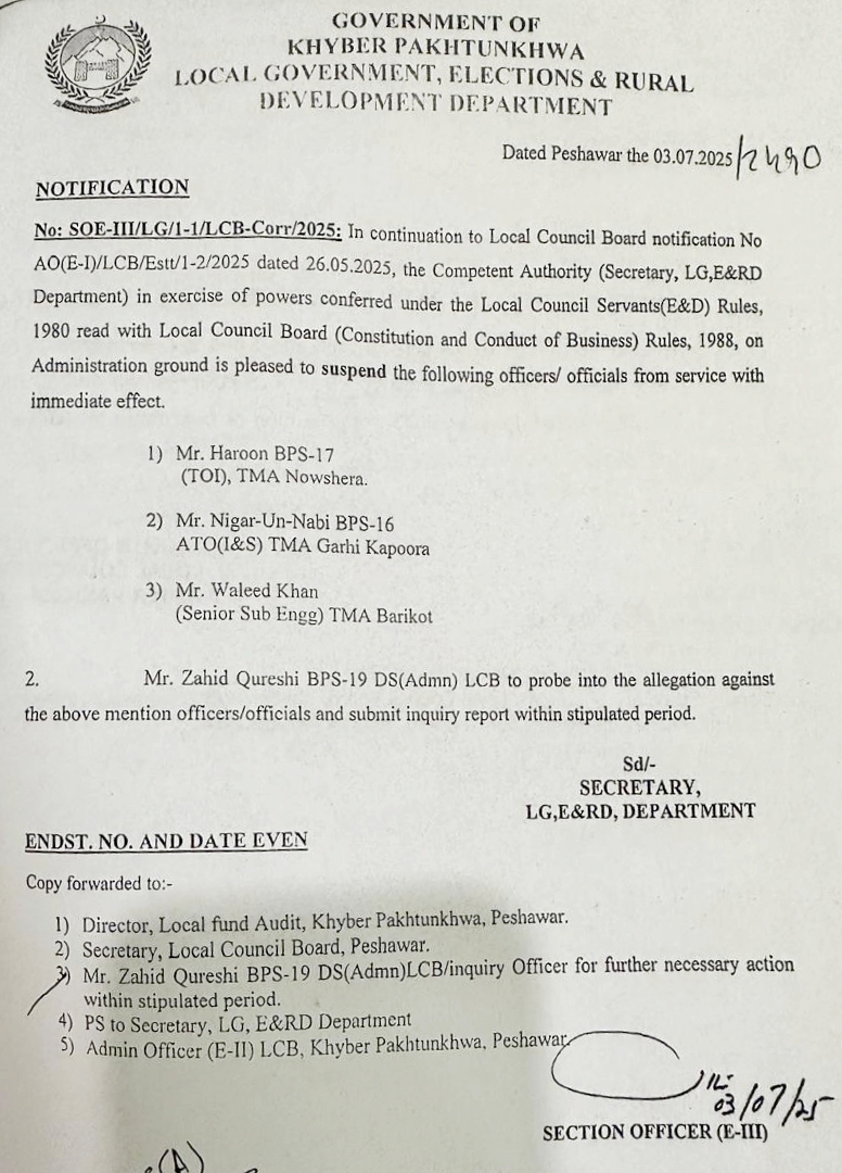 مردان(خصوصی نمائندہ) عاطف خان ممبر قومی اسمبلی کے فنڈز میں خرد برد کرنے پر پراونشل یونیفائیڈ گروپ آف فنکشنریز کے تین اھم افسران کو لوکل کونسل بورڈ کی طرف سے نوکری سے معطلی کے احکامات جاری کر دیئے گئے ھیں تفصیلات کے مطابق لوکل کونسل بورڈ کی جانب سے انفراسٹرکچر برانچ کے تین انجنیئرز کو تادیبی کاروائی عمل میں لاتے ھوئے نوکری سے معطل کر دیا ھے جن میں ہارون B-17 تحصیل افیسر انفراسٹرکچر TMA نوشہرہ، نگار النبی اسسٹنٹ تحصیل افیسر انفراسٹرکچر TMA گڑھی کپورہ مردان اور ولید خان سینئر سب انجنئیر TMA بریکوٹ شامل ہیں۔ لوکل کونسل بورڈ کے ذرائع کے مطابق اتھارٹی مجاز کی اجازت سے تینوں انجنئیرز کو معطل کر کے ڈپٹی سیکریٹری ایڈمن زاہد قریشی کو انکوائری سونپ کر مقررہ وقت کے اندر انکوائری رپورٹ پیش کرنے کی ہدایات جاری کی گئیں ہیں۔یاد رہے کہ اس سلسلہ میں قبل ازیں سینئر افیسر سرفراز خان پہلے سے معطل ہیں جن کی انکوائری کے فرائض بھی لوکل کونسل بورڈ کے اھم اور قابل افیسر زاہد قریشی سرانجام دے رہے ہیں۔عاطف خان ممبر قومی اسمبلی نے اپنے فنڈز میں خرد برد کی تحقیقات کے چیف سیکریٹری خیبرپختونخوا کو تحریری شکایت کی تھی۔