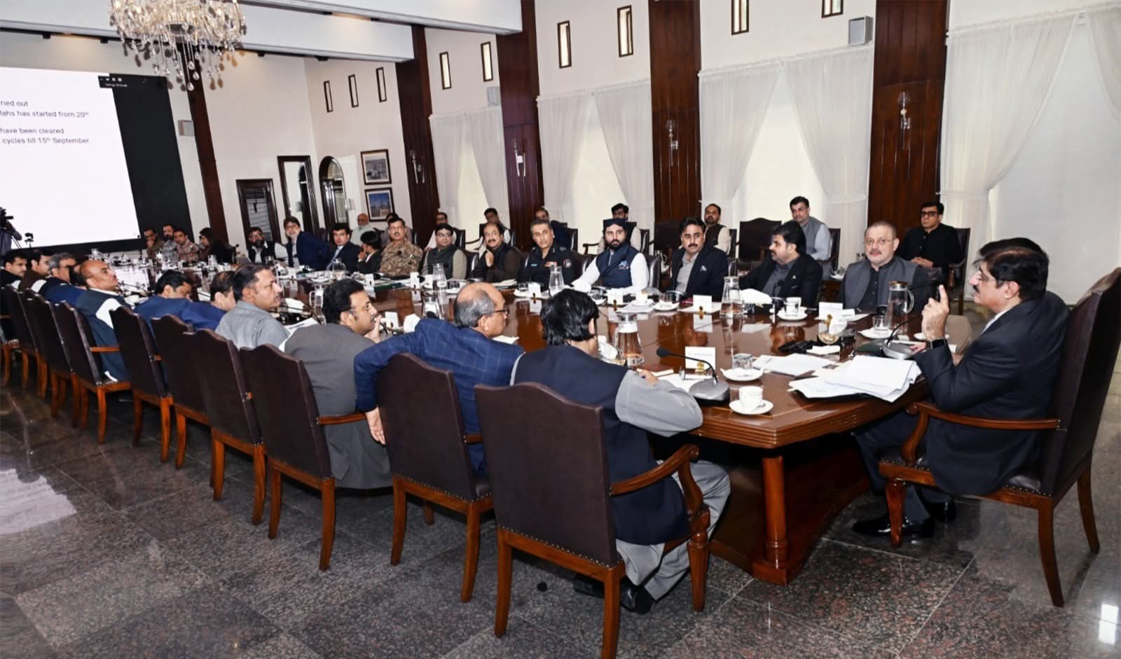 The meeting, held at the CM, included provincial ministers Sharjeel memon, Nasir Shah, Saeed Ghani, Jam Khan Shoro, Zia Lanjar, Mohammd Bux Mahar, Mohammad Ali Malkani, Mayor Karachi Murtaza Wahab, IG Police Ghulam Nabi Memon, Commissioner Karachi Hassan Naqvi, subaie secretaries, Chief Metrologist Ameer Hyder, Disaster Management, water Board, KE, Solid Waste heads and representatives from the Corps-V.