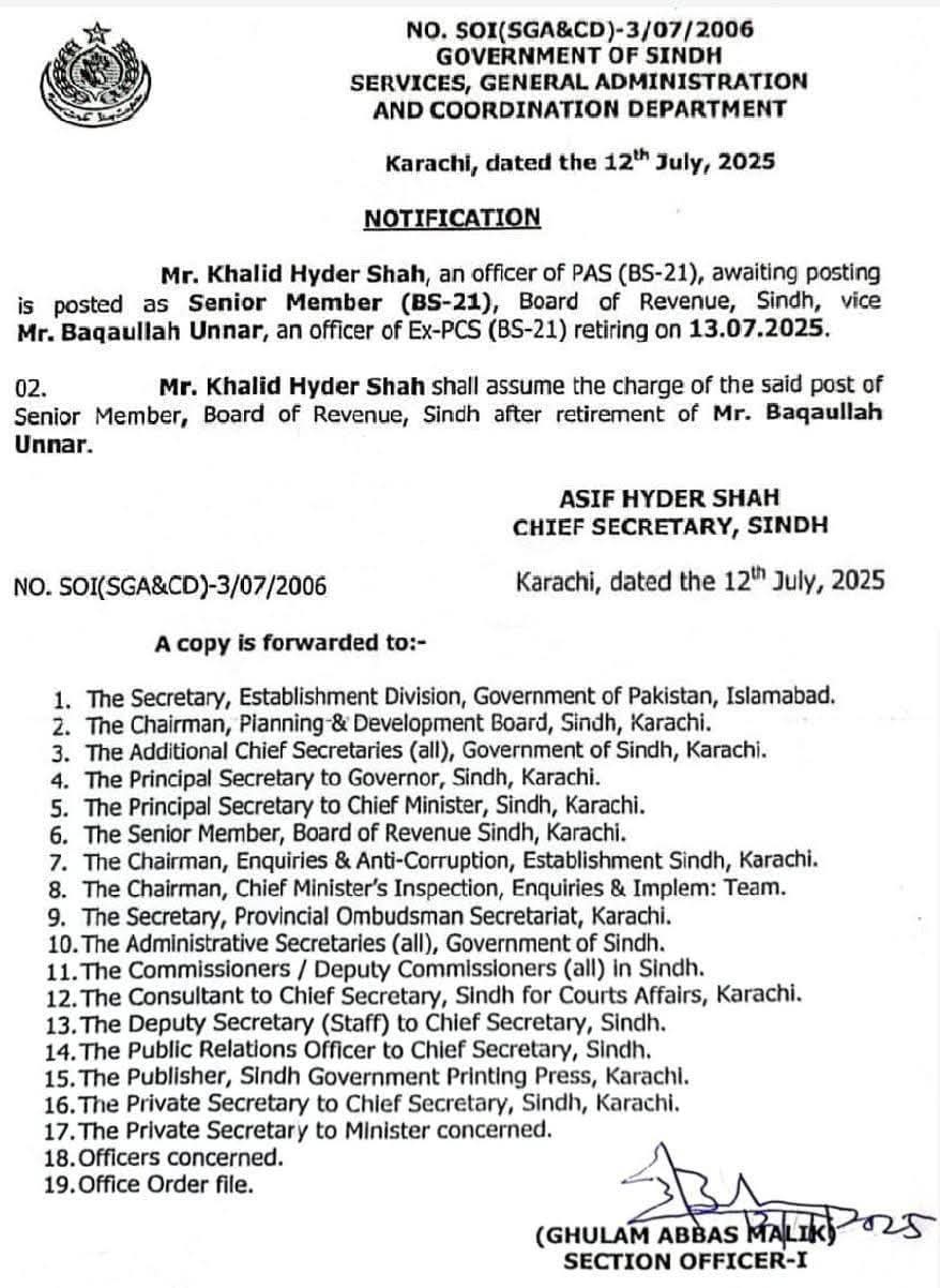 حکومت سندھ نے سابق ایڈیشنل چیف سیکرٹری بلدیات خالد حیدر شاہ کو سینئر ممبر بورڈ آف ریونیو تعینات کردیا ہے۔