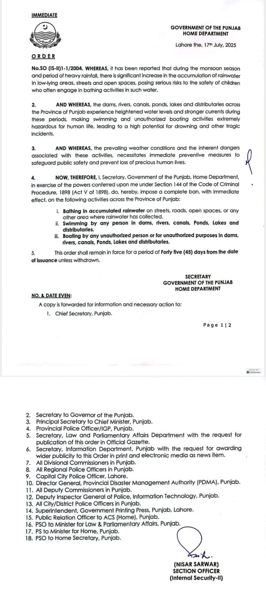 شدید بارشوں کے دوران اس پانی میں نہانے سے بچوں اور نوجوان کو شدید خطرات لاحق ہو سکتے ہیں۔پنجاب بھر کے ڈیموں، دریاؤں، نہروں، تالابوں اور جھیلوں میں ان دنوں پانی کی سطح بلند ہے۔ایسی صورتحال میں تیراکی اور کشتی رانی انسانی زندگی کیلئے انتہائی خطرناک ہے۔انتظامیہ اور قانون نافذ کرنے والے ادارے حکم نامے پر عملدرآمد یقینی بنائیں *عوامی آگاہی کیلئے دفعہ 144 کے نفاذ کی بھرپور تشہیر کی ہدایت کی گئی ہے*