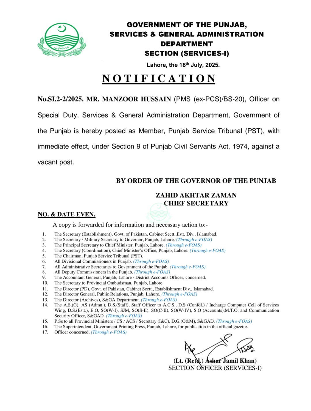 پنجاب میں بڑے پیمانے پرتقرروتبادلے،اسد اللہ تبدیل،خرم پرویز چیف ایگزیکٹو آفیسر پنجاب رورل میونسپل سروسز کمپنی تعینات