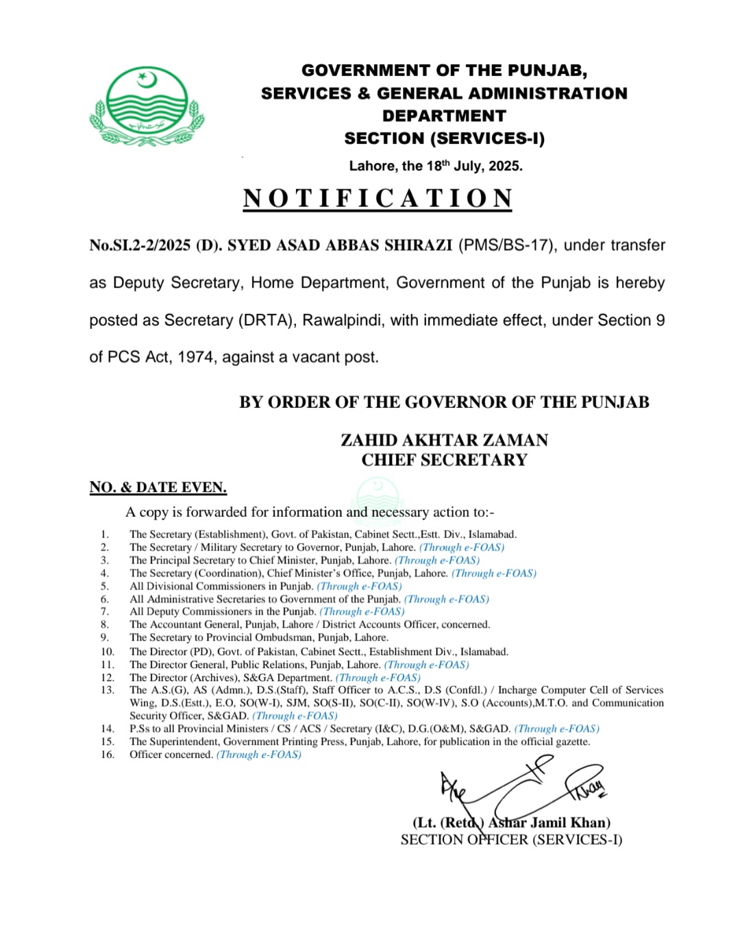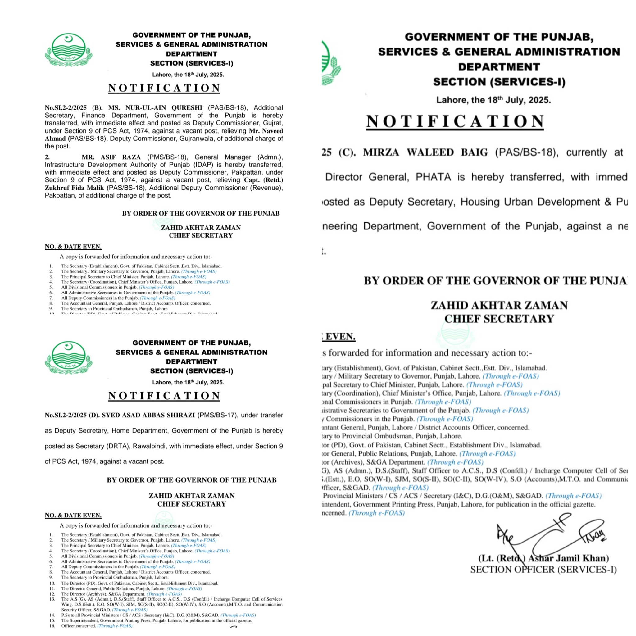 ایڈیشنل ڈپٹی کمشنر ریونیو کیپٹن(ر) زخروف فدا ملک سے ڈپٹی کمشنر پاکپتن کا اضافی چارج واپس لے لیا گیا ہے۔ڈپٹی سیکرٹری محکمہ داخلہ سید اسد عباس شیرازی تبدیل کر دیا گیا ہے ۔سید اسد عباس شیرازی سیکرٹری ڈسٹرکٹ ریجنل ٹرانسپورٹ اتھارٹی راولپنڈی تعینات کیا گیا ہے۔مرزا ولید بیگ ڈپٹی سیکرٹری ہاوسنگ اربن ڈوپلپمنٹ اینڈ پبلک ہیلتھ انجینئرنگ تعینات کیا گیا ہے۔