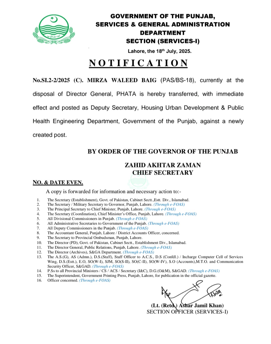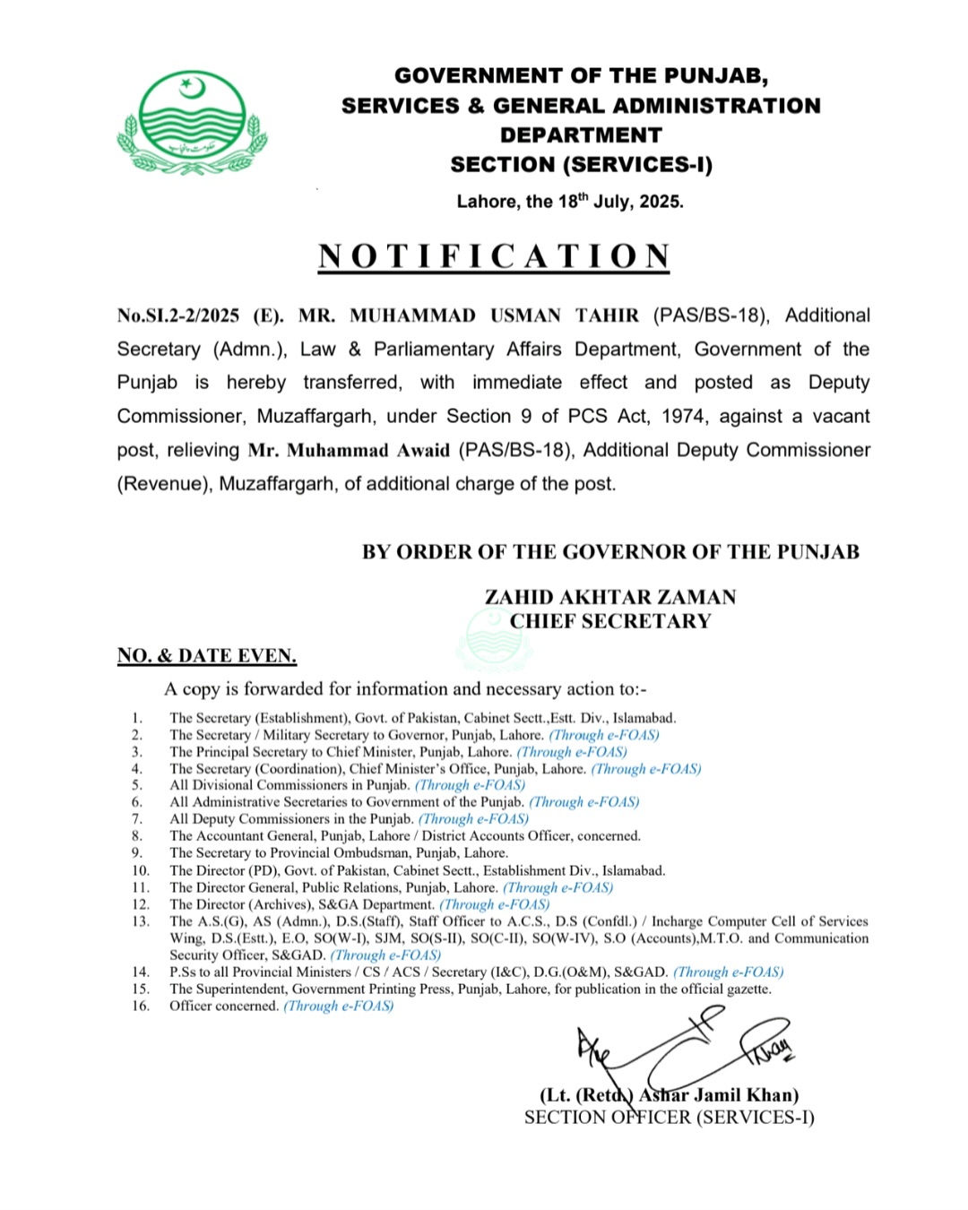 محمد عثمان طاہر ڈپٹی کمشنر مظفرگڑھ تعینات کر دیا گیا ہے
