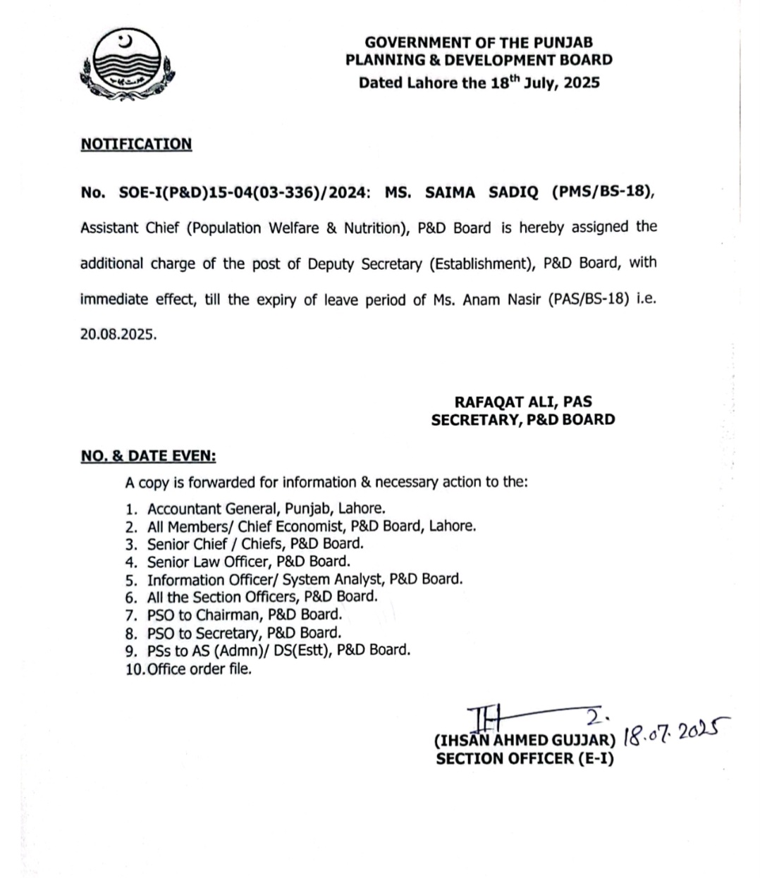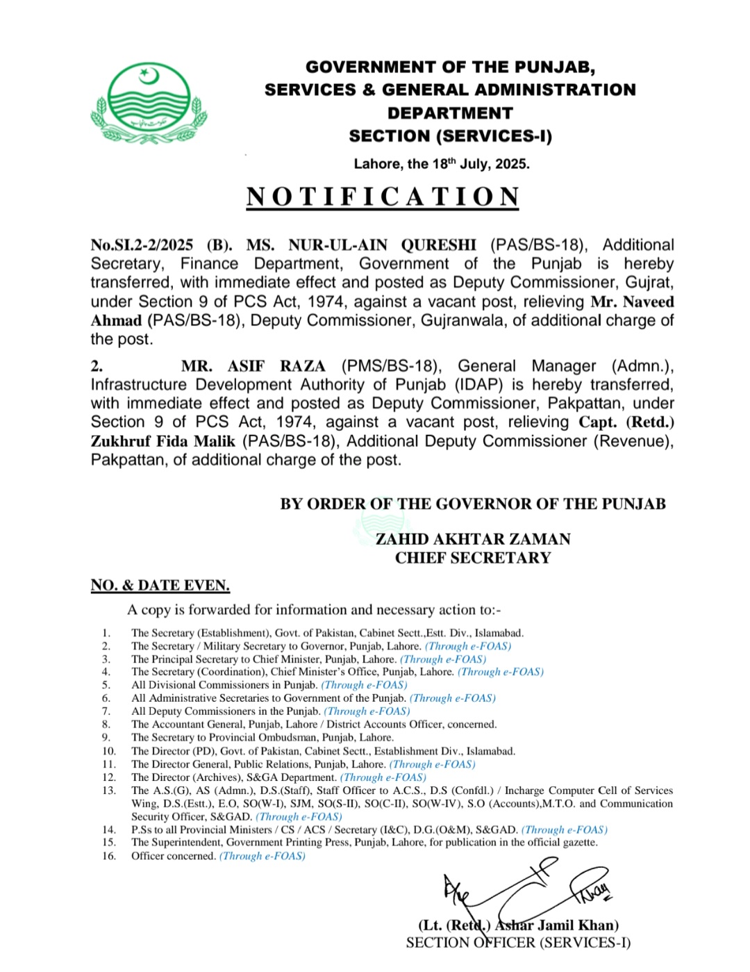 ایڈیشنل سیکرٹری محکمہ خزانہ نورالعین قریشی کو ڈپٹی کمشنر گجرات تعینات کر دیا گیا ہے۔