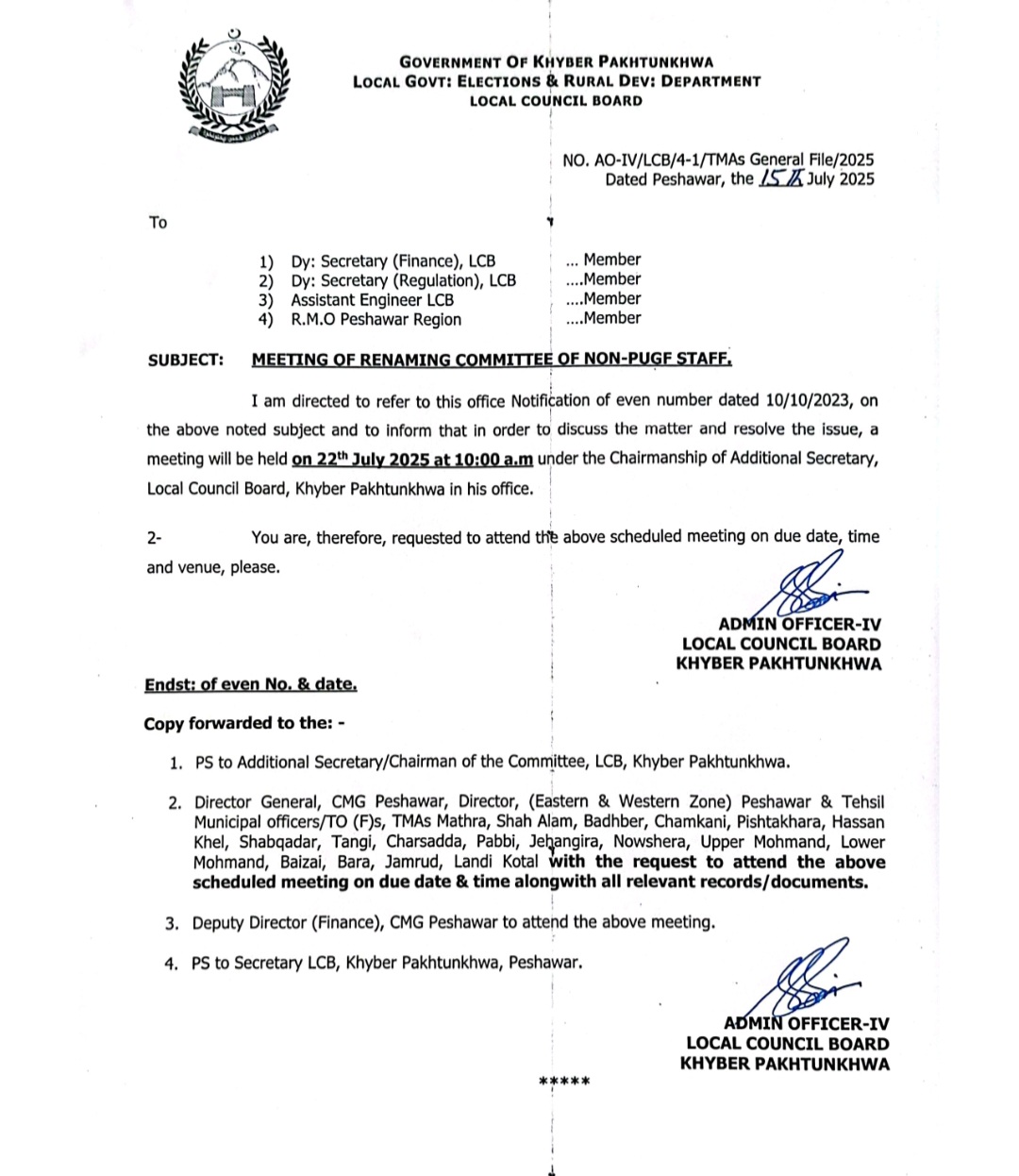 پشاور(بلدیات ٹائمز) لوکل گورنمنٹ ایمپلائز فیڈریشن رجسٹرڈ خیبرپختونخوا کے پرزور مطالبہ پر سروس سٹرکچر پر عمل درآمد یقینی بنانے کے لئے پہلے مرحلے میں ری نیمنگ کمیٹی کی باقاعدہ میٹنگ طلب کر لی گئی ھے۔ تفصیلات کے مطابق نان پی یو جی ایف سٹاف کے سروس سٹرکچر کو عملی جامہ پہنانے کےلئے پہلے مرحلے میں تحصیل میونسپل ایڈمنسٹریشنز پشاور میٹروپولیٹن گورنمنٹ کے ڈائریکٹر جنرل، ڈائیریکٹرز ایسٹ اینڈ ویسٹ اور متھرا ، شاہ عالم ، بڈ بیر ، چمکنی ، پشہ خرہ، حسن خیل، چارسدہ ، تنگی ، شبقدر ، پبی ، نوشہرہ ، جہانگیرہ ، اپر مہمند ، لوئر مہمند ، بایہ زئی ، جمرود ، باڑہ اور لنڈیکوتل کے تحصیل میونسپل آفیسرز اور تحصیل آفیسرز فنانس کو ھمراہ تمام متعلقہ ریکارڈ میٹنگ میں تاریخ اور وقت مقررہ پر طلب کر لیا گیا ھے جس کے لئے لوکل کونسل بورڈ کی طرف سے باقاعدہ خطوط تحت نمبری AO-IV/LCB/4-1/TMAs General File مجاریہ 15 جولائی 2025 جاری کیا گیا ھے۔مزید برآں لوکل گورنمنٹ ایمپلائز فیڈریشن رجسٹرڈ خیبرپختونخوا کے عہدیداران سرپرست اعلیٰ شوکت کیانی ، چئیرمین محبوب اللہ ، صدر حاجی انور کمال خان مروت نے متعلقہ TMAs کے یونین رہنماؤں کو آگاہ کیا ہے کہ وہ اپنی اپنی تحصیل کونسلز کی ضروری پوسٹوں کی ری نیمنگ کے لئے TOF کو ھمراہ ریکارڈ بروقت میٹنگ میں حاضری یقینی بنائیں۔