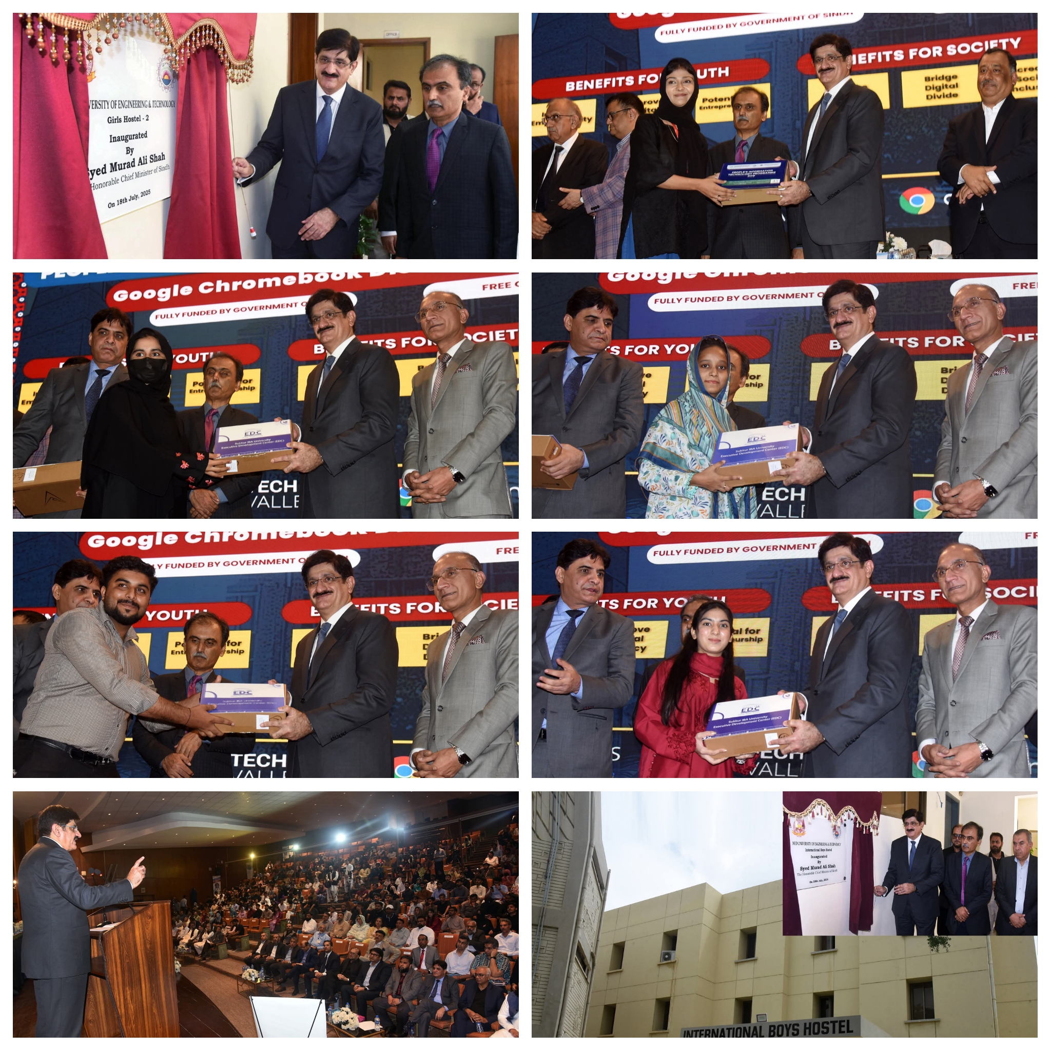 وزیراعلیٰ سندھ سید مراد علی شاہ نے این ای ڈی یونیورسٹی میں نئی تعمیر شدہ عمارتوں کی افتتاحی تقریب اور پیپلز انفارمیشن ٹیکنالوجی پروگرام (پی آئی ٹی پی) کے اعلیٰ کارکردگی کا مظاہرہ کرنے والے طلبہ میں کروم بکس تقسیم کرنے کی تقریب سے خطاب کرتے ہوئے اپنی حکومت کی اعلیٰ تعلیم، ڈیجیٹل بااختیاری اور نوجوانوں کی ترقی کے لیے عزم کا اعادہ کیا۔یہ تقریب این ای ڈی یونیورسٹی میں منعقد ہوئی جس میں سندھ ہائیر ایجوکیشن کمیشن کے چیئرمین پروفیسر ڈاکٹر طارق رفیع، سی آئی ای سی کے چیئرمین ڈاکٹر سروش لودھی، آئی ٹی کے چیئرمین نور احمد سموں، سیکریٹری یونیورسٹیز اینڈ بورڈز عباس بلوچ، مہران یونیورسٹی، سکھر آئی بی اے اور این ای ڈی کے وائس چانسلرز، سینئر فیکلٹی، پی آئی ٹی پی ٹیموں اور طلبہ نے شرکت کی۔مراد علی شاہ نے فخریہ اعلان کیا کہ سندھ نے موجودہ مالی سال میں سرکاری شعبے کی جامعات کے لیے 42 ارب روپے مختص کیے ہیں جو تمام صوبوں میں سب سے زیادہ ہیں تاکہ ان جامعات کی عملی ضروریات، تحقیق، انفراسٹرکچر اور جدت کی حمایت کی جا سکے۔وزیراعلیٰ نے این ای ڈی یونیورسٹی میں دو بڑے انفراسٹرکچر منصوبوں کا افتتاح بھی کیا جن میں جدید تجربہ گاہوں سے لیس فوڈ انجینئرنگ ڈیپارٹمنٹ کی نئی عمارت شامل ہے جس پر 96.48 ملین روپے کی لاگت آئی ہے۔ 112 طلبہ کے لیے رہائش کی گنجائش والی انٹرنیشنل بوائز ہاسٹل کا بھی افتتاح کیا گیا۔ ہاسٹل کو 67.11 ملین روپے کی لاگت سے تعمیر کیا گیا۔اس کے علاوہ 98.52 ملین روپے کی لاگت سے تعمیر کردہ 52 طالبات کے لیے مخصوص گرلز ہاسٹل بلاک کو انجینئرنگ اور ٹیکنیکل تعلیم میں صنفی شمولیت کے فروغ کے لیے ایک اہم قدم کے طور پر تسلیم کیا گیا۔*پی آئی ٹی پی: ڈیجیٹل شمولیت کے لیے ایک مثالی ماڈل*