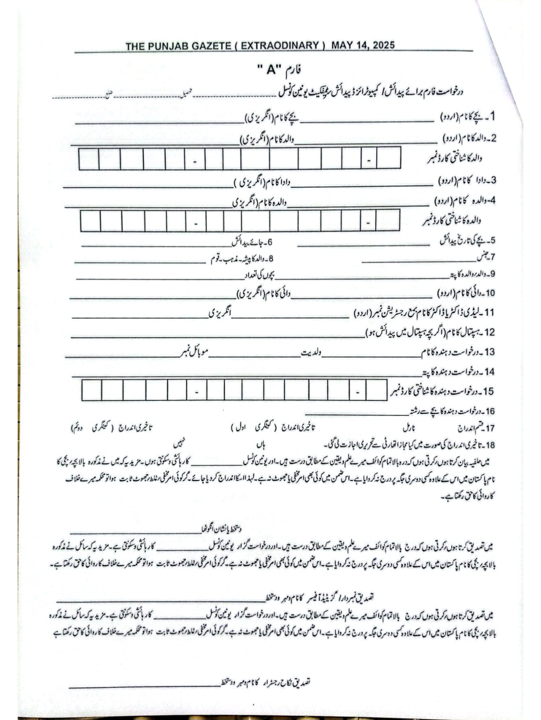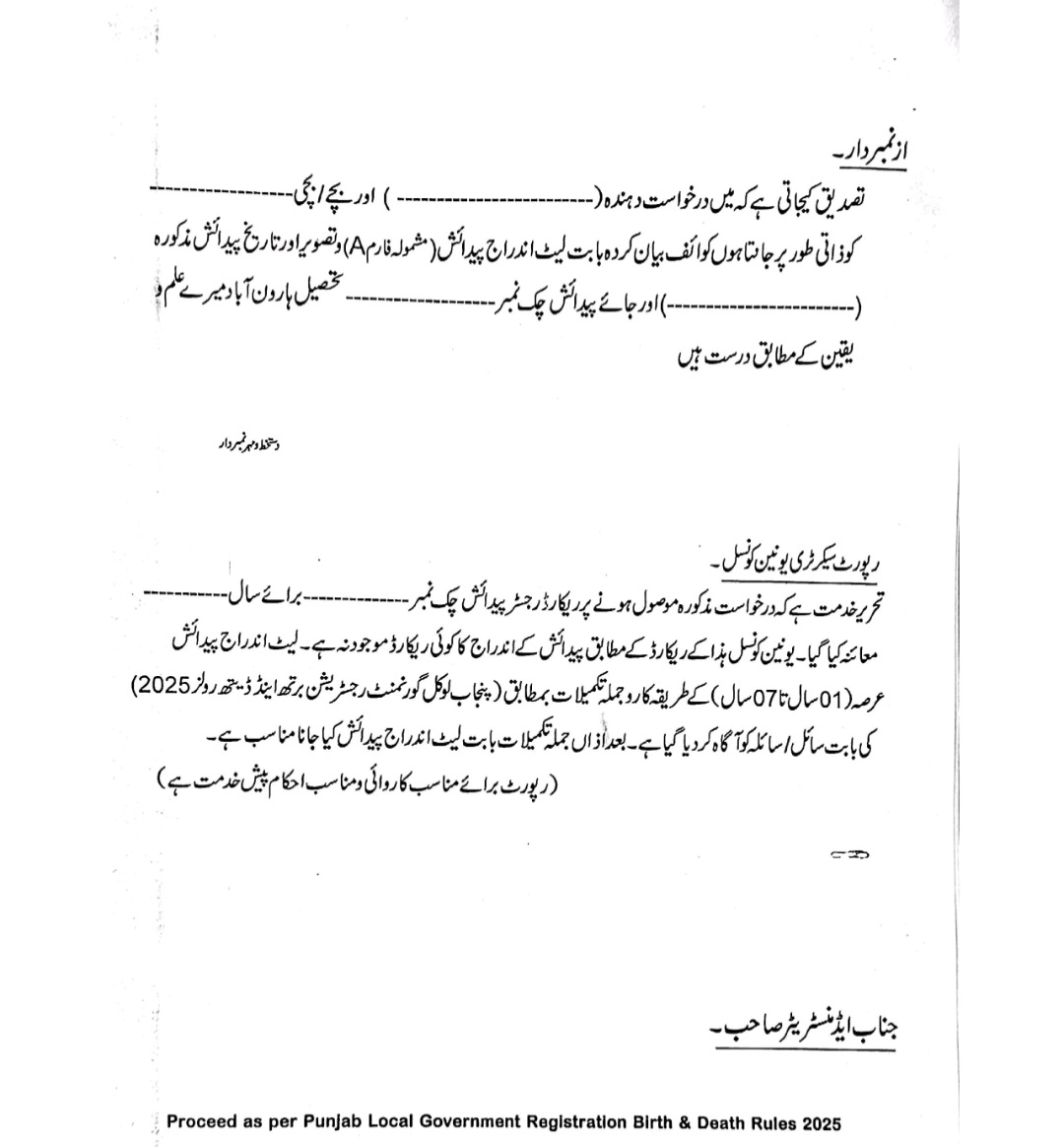 واضع رہے کہ محکمہ لوکل گورنمنٹ اینڈ کمیونٹی ڈویلپمنٹ پنجاب کے گزٹ نوٹیفکیشن کے مطابق سات سال کے کم لیٹ اندراج فری ہے