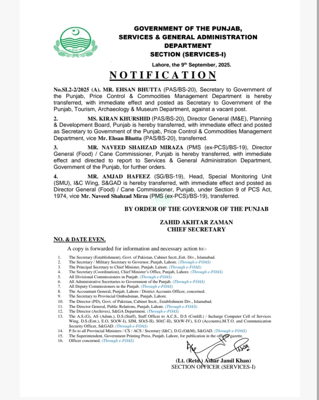 ڈائریکٹر جنرل فوڈ/ کین کمشنر پنجاب نوید شہزاد مرزا کو عہدے سے ہٹا دیا گیا ہے۔گریڈ 19 کے امجد حفیظ کو ڈائریکٹر جنرل فوڈ/ کین کمشنر پنجاب تعینات کردیا گیا ہے۔