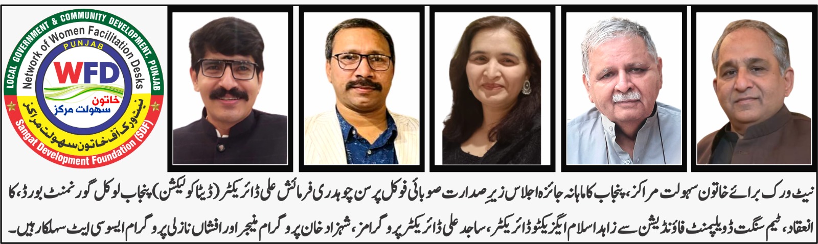 خاتون سہولت مراکز نیٹ ورک، پنجاب کا ماہانہ جائزہ اجلاس 31 جولائی 2025ء کو منعقد ہوگا۔ اجلاس کی صدارت صوبائی فوکل پرسن چوہدری فرمائش علی ڈائریکٹر (ڈیٹا کولیکشن) پنجاب لوکل گورنمنٹ بورڈ، حکومت پنجاب کریں گے جبکہ ٹیم سنگت ڈویلپمنٹ فاؤنڈیشن سے زاہد اسلام ایگزیکٹو ڈائریکٹر، ساجد علی ڈائریکٹر پروگرامز، شہزاد حیدر خان پروگرام منیجر اور افشاں نازلی پروگرام ایسوسی ایٹ سہلکاری کی خدمات سرانجام دیں گے۔ اجلاس میں ماہانہ کارکردگی رپورٹ بذریعہ چیف آفیسرز بابت خاتون سہولت ڈیسک و خواتین کھلی کچہری، رواں ماہ کے دوران نمایاں اقدامات، آئندہ ماہ کے اہداف۔ ماہانہ نیوز بلیٹن کے لئے مواد کی فراہمی، ڈبلیو ایف ڈی کی تشہیر کے ضمن میں اقدامات کا جائزہ اور سوشل میڈیا کے موثر استعمال پر تبادلہ خیالات کیا جائے گا۔ اجلاس میں میونسپل کارپوریشز بہاولپور، ڈیرہ غازی خان، راولپنڈی، ساہیوال، سرگودھا، سیالکوٹ، شیخوپورہ، فیصل آباد، گجرات، گوجرانوالہ، مری، ملتان چیف آفیسرز شریک ہوں گے اسی طرح میونسپل کمیٹی اٹک، بہاولنگر، بھکر، چکوال، چنیوٹ، حافظ آباد، جھنگ، جہلم، قصور، خانیوال، خوشاب، کبیر والہ، کوٹ ادو، کھیوڑہ، گوجرہ، لیہ، لودھراں، منڈی بہاؤالدین، میانوالی، مظفر گڑھ، ننکانہ صاحب، ناروال، اوکاڑہ، پاکپتن، رحیم یار خان، شالیمار ذونل آفس، لاہور، راجن پور، تلہ کنگ، تونسہ شریف، ٹوبہ ٹیک سنگھ، وہاڑی اور وزیر آباد کے چیف آفیسرز شرکت کریں گے۔