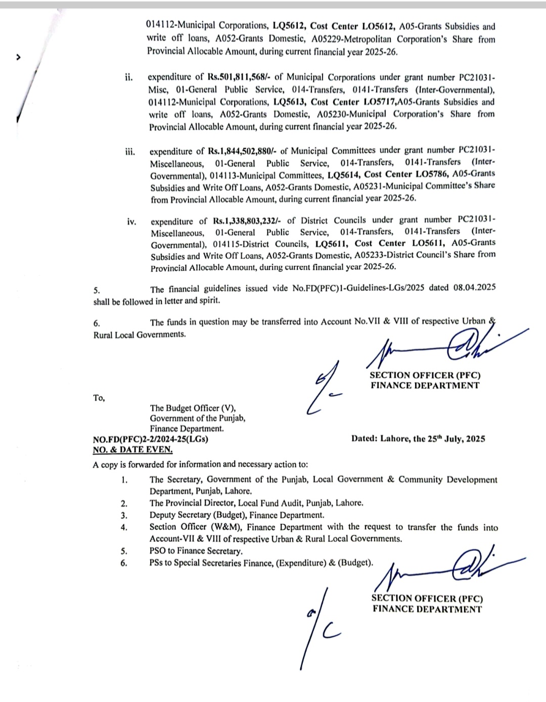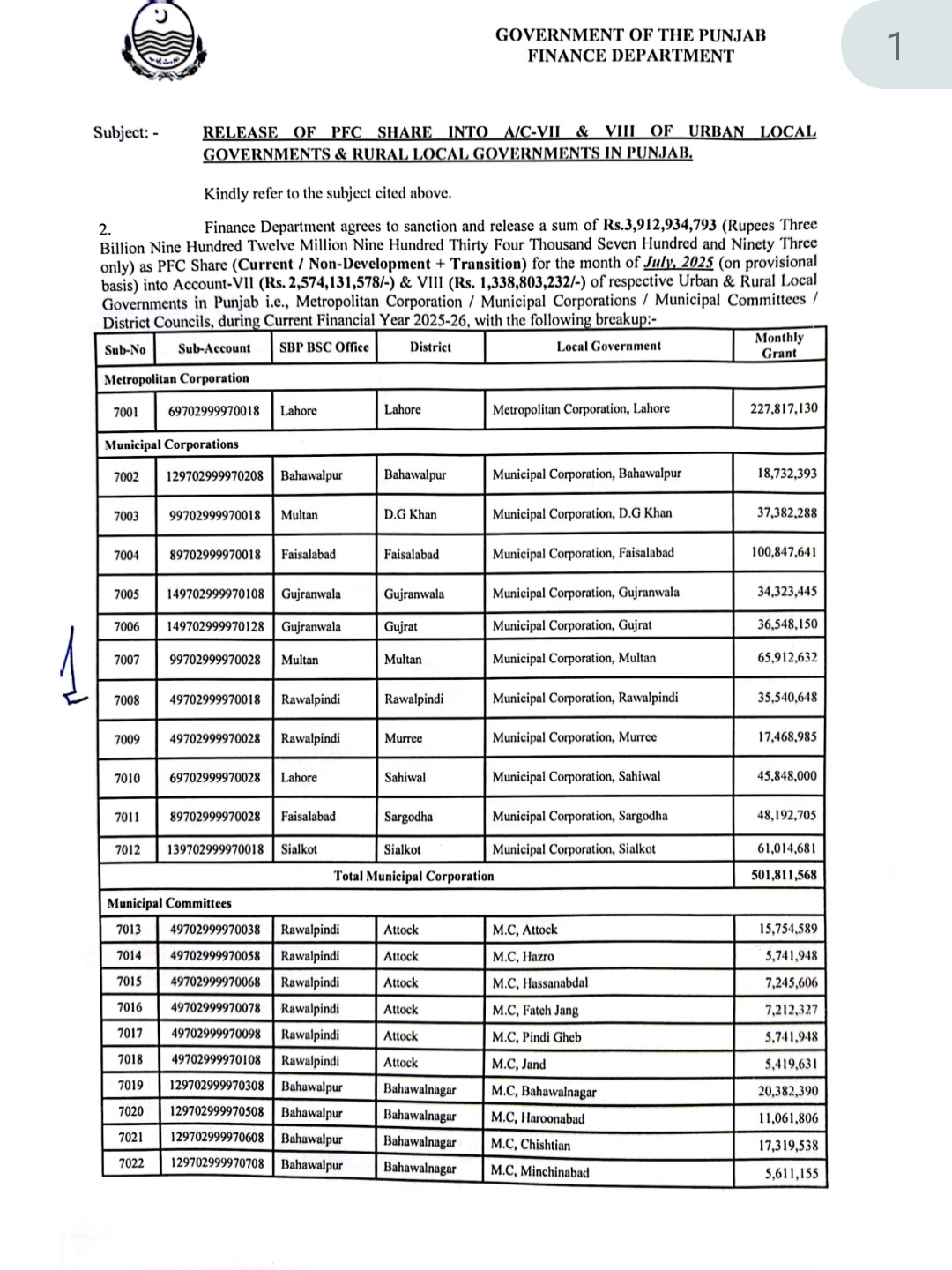مالی سال 2024۔25 میں بلدیاتی اداروں کو کرنٹ پی ایف سی شیئر 40 ارب 83 کروڑ روپے جاری ہوا۔ رواں مالی سال 46 ارب 95 کروڑ 48 لاکھ روپے نان ڈویلپمنٹ شیئر کی مد میں 229 بلدیاتی اداروں کو جاری کئے جائیں گے۔پنجاب حکومت کو طرف سے رواں مالی سال بھی بلدیاتی اداروں کو گذشتہ سالوں کی طرح پی ایف سی ڈویلپمنٹ شیئر جاری نہیں کیا جائے گا۔میٹروپولیٹن کارپوریشن لاہور کا ماہانہ کرنٹ پی ایف سی شیئر 19 کروڑ 81 لاکھ روپے سے بڑھ کر 22 کروڑ 78 لاکھ 17 ہزار روپے ہو گیا ہے۔پنجاب کی میونسپل کارپوریشنز کا پی ایف سی ماہانہ 43 کروڑ 63 لاکھ روپے سے بڑھا کر 50 کروڑ18 لاکھ روپے کر دیا گیا ہے۔ضلع کونسلوں کا ماہانہ شیئر ایک ارب 16 کروڑ 41 لاکھ سے ایک ارب 33 کروڑ 88 لاکھ ہو گیا ہے۔میونسپل کمیٹیوں کا کرنٹ پی ایف سی شیئر ایک ارب 60 کروڑ 39 لاکھ روپے سے بڑھا کر ایک ارب 84 کروڑ 45 لاکھ روپے کر دیا گیا ہے۔محکمہ خزانہ پنجاب نے بلدیاتی اداروں کو 10 فیصد اضافہ کے ساتھ 3 ارب 91 کروڑ 29 لاکھ روپے کا جولائی کا کرنٹ پی ایف سی شیئر جاری کر دیا ہے۔