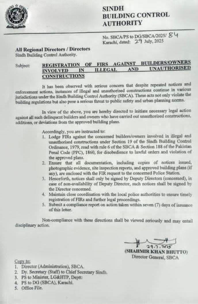 سندھ بلڈنگ کنٹرول اتھارٹی (SBCA) نے غیر قانونی اور غیر منظور شدہ تعمیرات میں ملوث بلڈرز اور پلاٹ مالکان کے خلاف سخت کارروائی کا آغاز کر دیا ہے, ڈائریکٹر جنرل ایس بی سی اے شاہ میر خان بھٹو کی جانب سے جاری کردہ ہدایت نامے میں تمام ریجنل ڈائریکٹرز کو ہدایت کی گئی ہے کہ وہ فوری طور پر ایسے تمام افراد کے خلاف ایف آئی آر درج کرائیں جو بغیر منظوری کے تعمیرات، نقشے سے انحراف یا دیگر خلاف ورزیاں کر رہے ہیں۔نوٹیفکیشن کے مطابق یہ کارروائی سندھ بلڈنگ کنٹرول آرڈیننس 1979 اور پاکستان پینل کوڈ کی دفعہ 188 کے تحت کی جائے گی, ڈی جی ایس بی سی اے نے ہدایت کی ہے کہ ایف آئی آرز کے ساتھ تمام ضروری شواہد جیسے نوٹسز کی نقول, سائٹ انسپیکشن رپورٹس, تصویری ثبوت اور منظور شدہ نقشے شامل کیے جائیں,اس کے علاوہ احکامات میں کہا گیا ہے کہ نوٹسز صرف متعلقہ ڈپٹی ڈائریکٹرز ہی جاری کریں گے, اور پولیس حکام کے ساتھ قریبی رابطے میں رہ کر بروقت قانونی کارروائی کو یقینی بنائیں