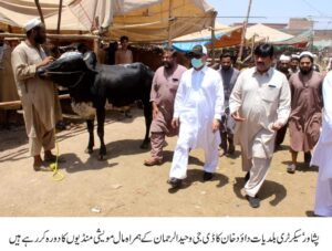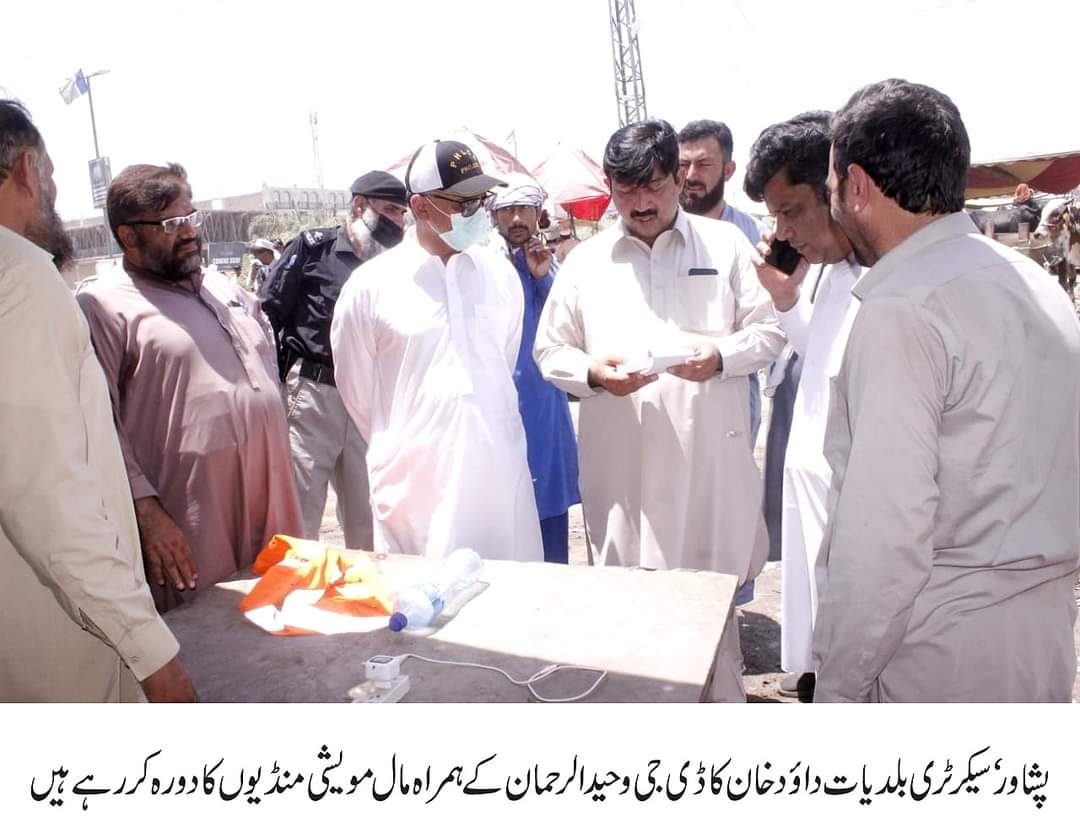 مال مویشی منڈیوں میں عوام کو بہترین سہولیات فراہم کرنے کی ہدایات جاری کئے, مویشیوں کا بھی ہر طرح کا خیال رکھا جائے اورہرقسم کی سہولیات فراہم کی جائے۔ رینگ روڈ پر قائم مویشی منڈی کا بھی دورہ کیا اور حکومت کی طرف سے عوام کو دی جانے والی سہولیات کے بارے میں آگاہی حاصل کیں، مویشی منڈیوں کے مختلف حصوں کا دورہ کیا، گائیڈ لائنز بھی چیک کئے، راستوں کو کھلا رکھنے اور عوام کے بیٹھنے کی جگہ توسیع کرنے کے احکامات جاری کئے۔ سیکرٹری بلدیات جناب داود خان نے فائر بریگیڈ سے پانی کا ٹینکر منگوایا اور جانوروں پر پانی کے چھڑکائوں کی ہدایات جاری کئے اور جس جگہ پر سائبان نہیں تھا اسے فوری یقینی بنانے کے بھی احکامات جاری کئے۔