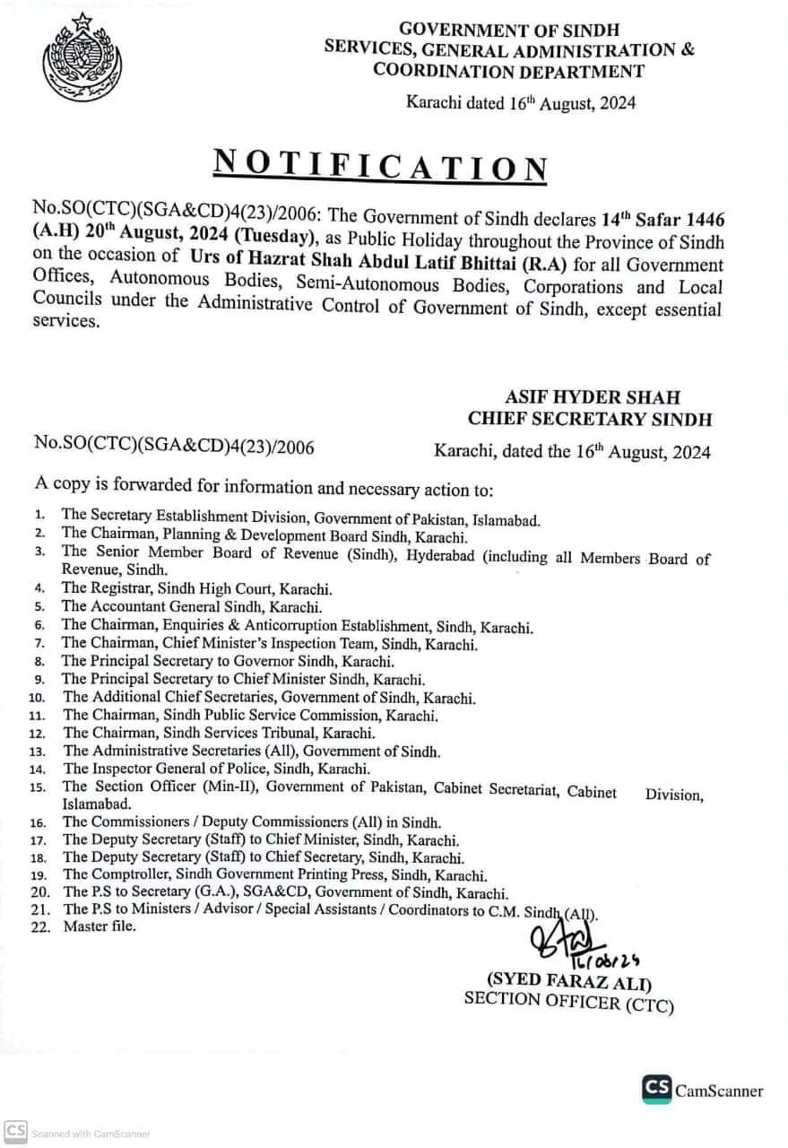 [عام تعطیل]-• سندھ میں حضرت شاہ عبدالطیف بھٹائی رح کے عرس کے سلسلے میں 20 اگست بروز منگل عام تعطیل ہے۔سندھ حکومت نے اس سلسلہ باقاعدہ نوٹیفکیشن جاری کردیا ہے۔