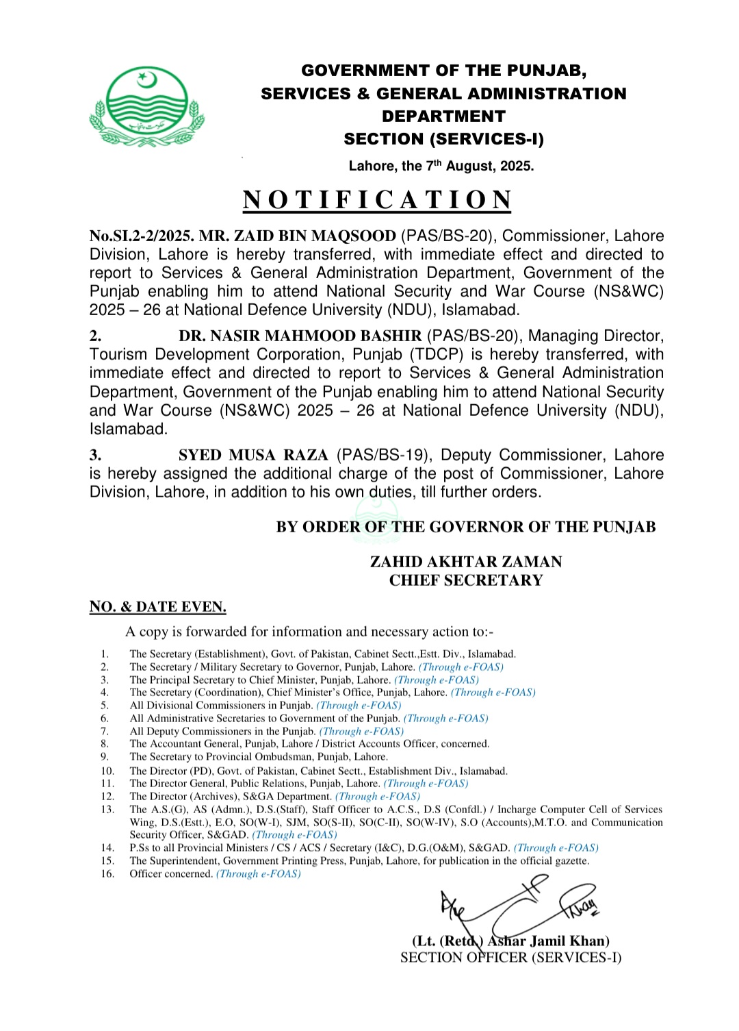 منیجنگ ڈائریکٹر ٹی ڈی سی پی ڈاکٹر ناصر محمود باجوہ کو بھی کورس کے سلسلہ میں محکمہ سروسز رپورٹ کرنے کی ہدایت کی گئی ہے۔ڈپٹی کمشنر لاہور سید موسٰی رضا کو کمشنر لاہور کا اضافی چارج سونپ دیا گیا ہے۔