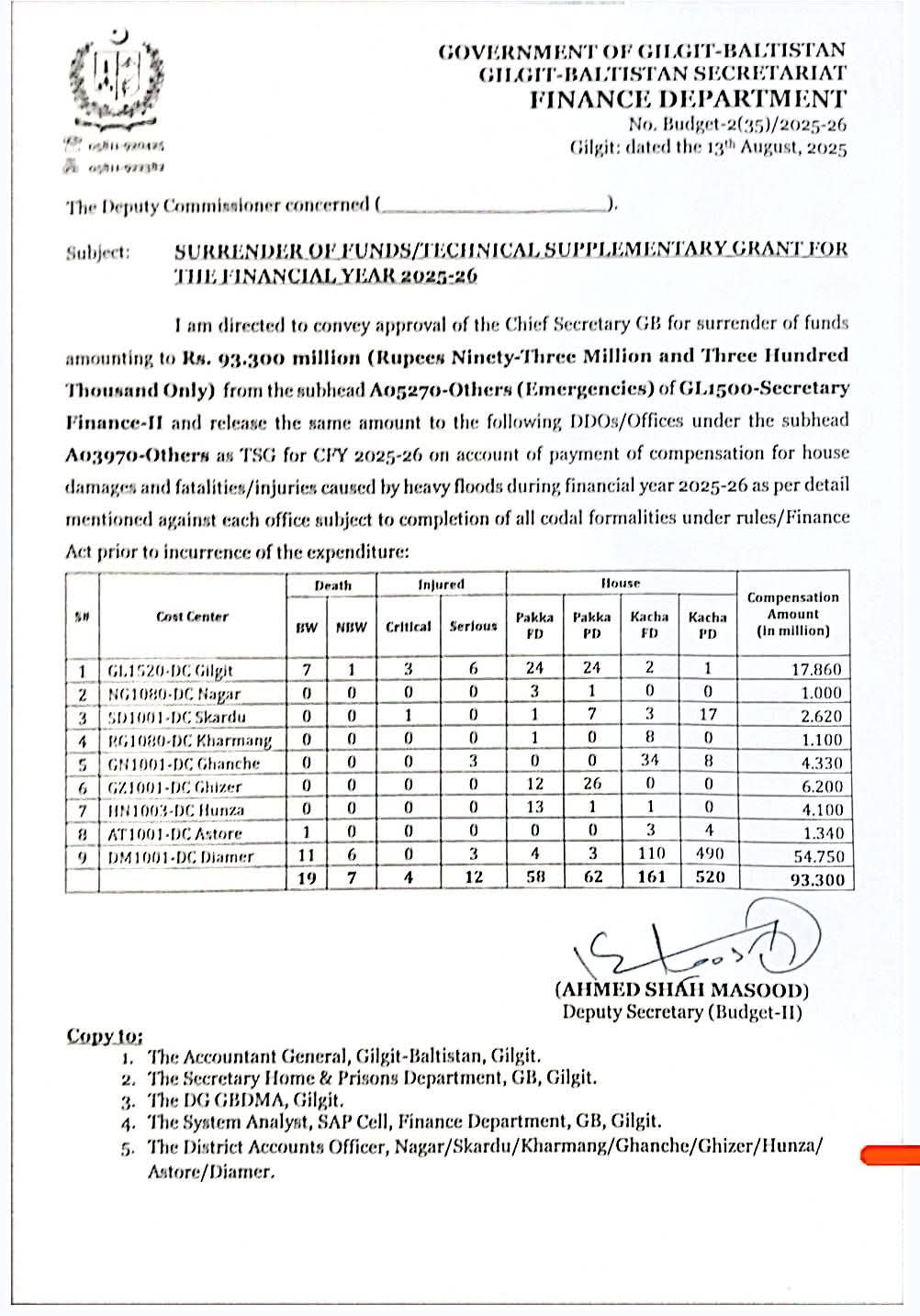 حکومتِ گلگت بلتستان, محکمہ خزانہ نے پہلی بار سیلاب سے متاثرہ افراد، خصوصاً جان بحق ہونے والوں، زخمیوں اور مکانات اور املاک کو پہنچنے والے نقصانات کی تلافی کے لیے متعلقہ اضلاع کے ڈپٹی کمشنرز کو براہِ راست 93.3 ملین روپے کی رقم جاری کر دی ہے۔ یہ فنڈز مالی سال 2025-26 کے دوران شدید بارشوں اور سیلاب سے ہونے والے جانی و مالی نقصانات کے ازالے کے لیے مختص کیے گئے ہیں۔چیف سیکرٹری گلگت بلتستان کی منظوری کے بعد یہ فنڈز فوری طور پر ڈپٹی کمشنرز کو منتقل کر دیے گئے ہیں، تاکہ متاثرہ خاندانوں کو بروقت، شفاف اور غیر جانبدارانہ طریقے سے معاوضے کی ادائیگی یقینی بنائی جا سکے۔ڈپٹی کمشنرز کو ہدایات جاری کی گئی ہیں کہ وہ تمام مالی و انتظامی ضوابط کا سختی سے پابند رہتے ہوئے، متاثرین کی فہرست کی توثیق کرکے معاوضے کی ادائیگی فوری عمل میں لائیں، تاکہ سیلاب زدہ افراد کو جلد از جلد امداد فراہم کی جا سکے۔ حکومتِ گلگت بلتستان کی طرف سے واضح کیا گیا ہے کہ عوامی فلاح و بہبود ان کی اولین ترجیح ہے اور سیلاب سے متاثرہ علاقوں کی بحالی کے لیے تمام دستیاب وسائل بروئے کار لائے جا رہے ہیں۔