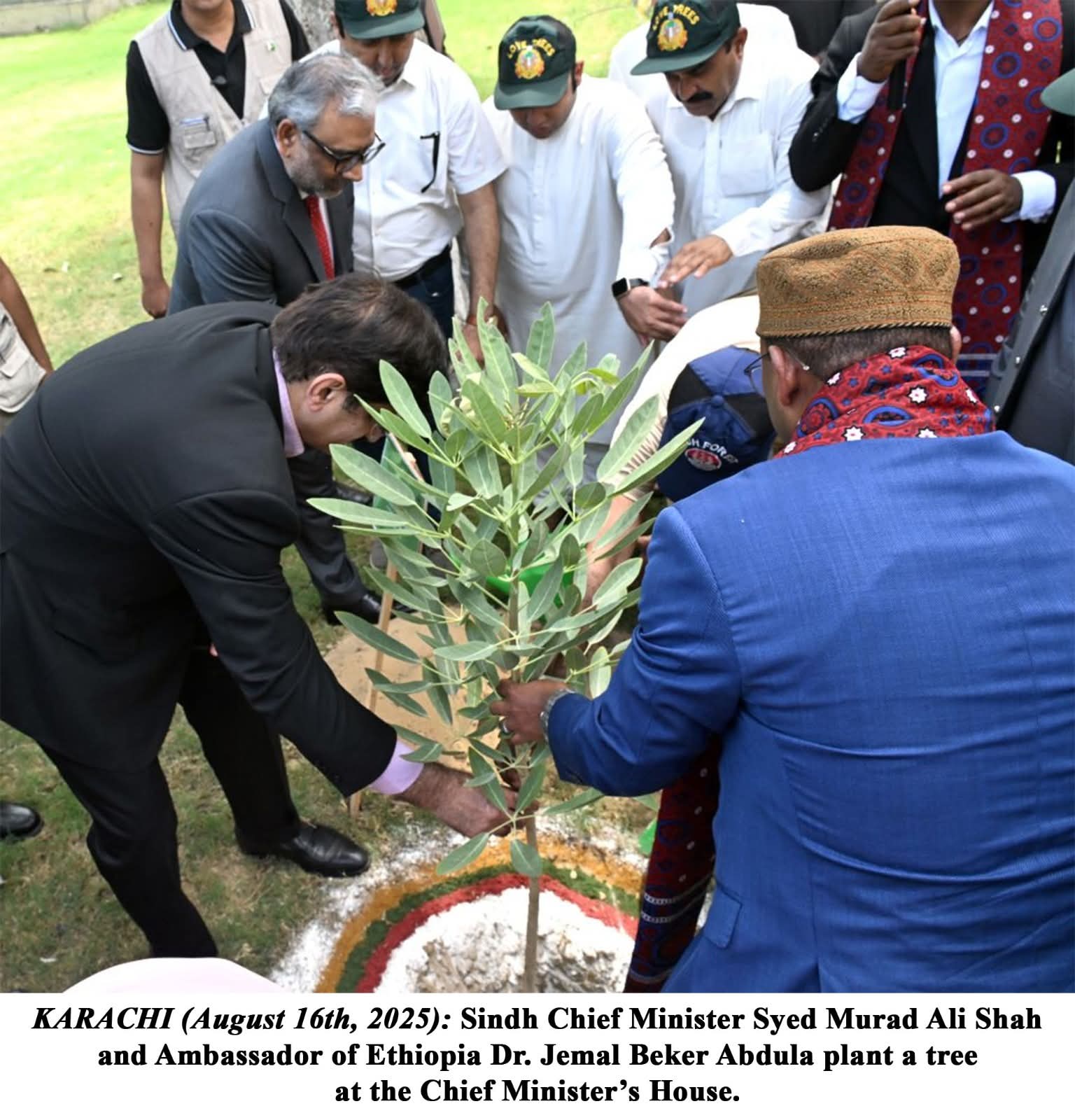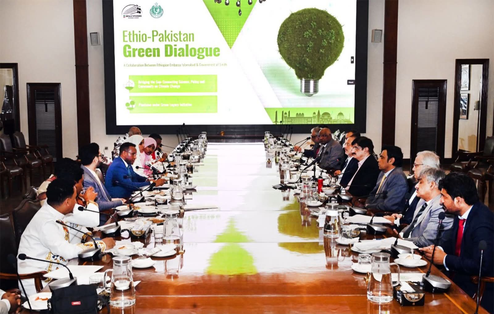 سندھ حکومت کی طرف سے سینئر وزیر شرجیل انعام میمن، چیف سیکریٹری آصف حیدر شاہ، پرنسپل سیکریٹری آغا واصف، سیکریٹری ٹرانسپورٹ اسد زمان، سیکریٹری ماحولیات و موسمیاتی تبدیلی زبیر چنا، سیکریٹری جنگلات، چیف کنزرویٹر ریاض وگن اور دیگر اعلیٰ حکام نے اجلاس میں شرکت کی۔مہمانوں کا خیرمقدم کرتے ہوئے، وزیر اعلیٰ سندھ نے کہا کہ ہمیں معزز وفد کی میزبانی کرتے ہوئے دلی خوشی ہوئی، بامعنی بات چیت ، معلومات کے تبادلے اور باہمی دلچسپی کے شعبوں کو دریافت کرنے کے اقدام کو سراہتے ہیں۔ آج آپ کی یہاں موجودگی دونوں قوموں کے درمیان دوستی اور تعاون کے مضبوط رشتے کو فروغ دینے کے مترادف ہے ۔ ہم ان تعلقات کو مزید مضبوط بنانے کے لیے پرعزم ہیں۔ایتھوپیا کی جانب سے وزیراعلیٰ کو گرین لیگیسی انیشیٹو کے حوالے سے بریفنگ دی گئی، جس کے مطابق ایتھوپیا 2019 سے اب تک 40 بلین سے زائد درخت لگا چکا ہے جبکہ 2026 تک 50 بلین درخت لگانے کا ہدف ہے، جس میں 2025 کے آخر تک 7.5 بلین ننے پودے بھی شامل ہیں۔سندھ کے چیلنجز کو اجاگر کرتے ہوئے مراد علی شاہ نے کہا کہ موسمیاتی تبدیلی ایک ناقابل تردید عالمی حقیقت ہے۔ انہوں نے سندھ میں 2022 کے تباہ کن سیلاب کا ذکر کیا ، جس میں 2.1 ملین گھر تباہ ہوئے، آبپاشی کے نظام کو نقصان پہنچا، لاکھوں ایکڑ زرعی زمین زیر آب آگئی اور غیرمعمولی معاشی نقصانات ہوئے۔ بڑھتا ہوا درجہ حرارت شہری سیلاب، جنگل کی آگ، برفانی تودوں کے پگھلنے اور سمندر کی سطح میں اضافے کا سبب بن رہا ہے۔ یہ بدنظمی اب دور دراز کے خطرات نہیں بلکہ ہماری روزمرہ کی حقیقت ہیں ۔وزیر اعلیٰ سندھ نے موسمیاتی تبدیلیوں سے نمٹنے کے لیے اہم اقدامات کا خاکہ پیش کرتے ہوئے کہا کہ سندھ پیپلز ہاؤسنگ فار فلڈ ایفیکٹیز (SPHF) کے ذریعے تقریباً 6 لاکھ مکانات مکمل ہوچکے ہیں، جب کہ 857,000 پلنتھ فاؤنڈیشنز زیر تعمیر ہیں جو علاقے میں آفات کے بعد کے سب سے بڑے ہاؤسنگ پروجیکٹس ہے۔مراد علی شاہ نے کاربن فنانس / کریڈٹس کے حوالے سے بات کرتے ہوئے کہا کہ سندھ پاکستان کا پہلا اور واحد صوبہ ہے جس نے پبلک پرائیویٹ پارٹنرشپ موڈ (DBC-1، DBC-2 اور DBC-3) کے تحت انٹرنیشنل کاربن کریڈٹ ٹریڈنگ ریجیم کے لیے کوالیفائی کیا ہے۔ ماحولیاتی نظام کو محفوظ بناتے ہوئے کاربن کریڈٹس میں لاکھوں امریکی ڈالر پہلے ہی کمائے جا چکے ہیں۔جنگلات کے حوالے سے بات کرتے ہوئے وزیراعلیٰ سندھ نے کہا کہ 2010 سے 2025 کے درمیان سندھ نے 675,000 ہیکٹر اراضی پر جنگلات کو ترقی دی ہے جس سے اس کے سبزہ زار میں نمایاں اضافہ ہوا ہے۔دونوں فریقوں نے شجرکاری، درختوں کی نئی انواع متعارف کرانے، پائیدار زراعت، جنگلات، قابل تجدید توانائی، کاربن ٹریڈنگ اور استعداد کار بڑھانے کے منصوبوں میں تعاون بڑھانے پر اتفاق کیا۔ملاقات کا اختتام ایتھوپیا کے وفد نے وزیراعلیٰ سندھ کے ہمراہ،سندھ میں مشترکہ گرین انیشیٹو کا باقاعدہ آغاز کرنے کے لیے وزیراعلیٰ ہاؤس میں پودا لگا کر کیا۔