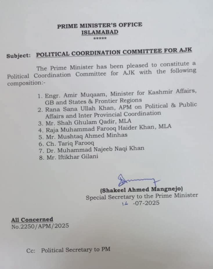 وزیراعظم شہباز شریف نے آزادکشمیر کے سیاسی معاملات کا جائزہ لینے کیلۓ 8 رکنی کمیٹی قائم کر دی..