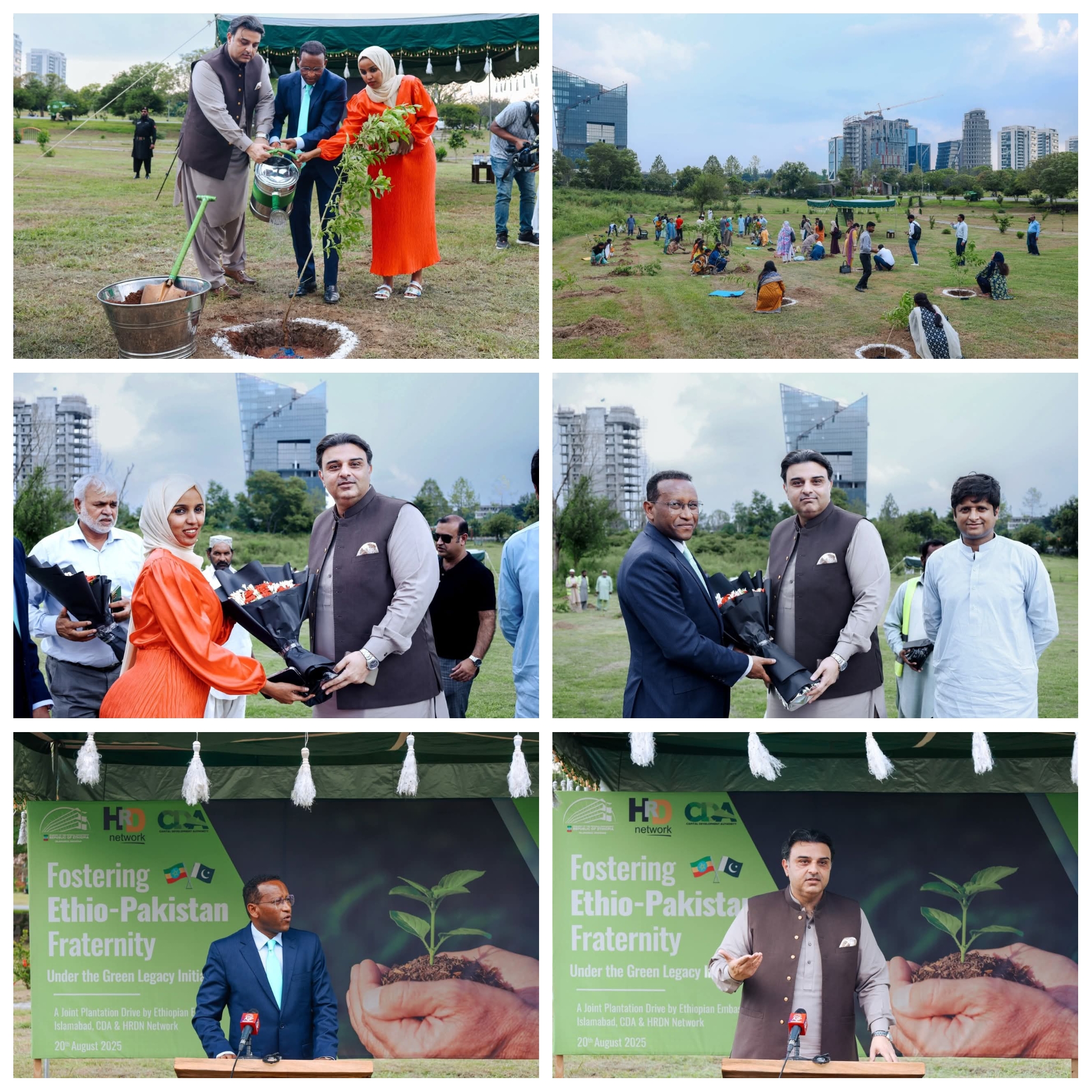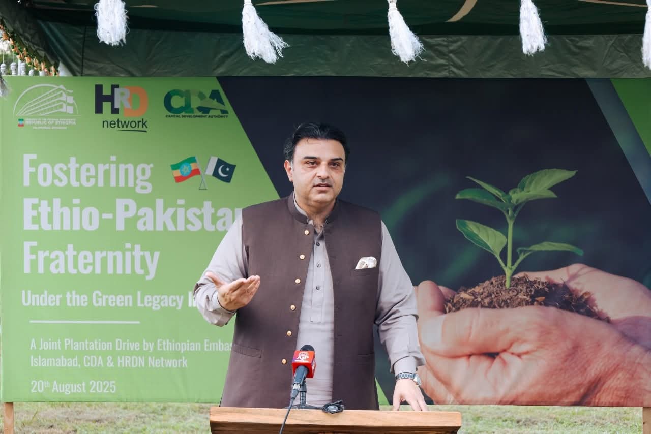 درخت لگانے کی تقریب میں شہریوں کی کثیر تعداد نے بڑھ چڑھ کر حصہ لیا، جس نے دونوں ممالک کے درمیان ماحولیاتی چیلنجز سے نمٹنے اور باہمی عوامی تعلقات کو مزید مضبوط بنانے کے عزم کی علامت قرار پایا۔ایتھوپیا کے سفیر ڈاکٹر جمال بیکر عبداللہ نے کہا کہ پاکستان ان ممالک میں شامل ہے جو موسمیاتی تبدیلیوں سے سب سے زیادہ متاثر ہوئے ہیں، حالانکہ عالمی کاربن اخراج میں اس کا حصہ نہ ہونے کے برابر ہے۔ انہوں نے کہا کہ ایتھوپیا کی حکومت نے موسمیاتی تبدیلی کے خلاف جنگ میں یکجہتی کے اظہار کے طور پر اپنا وفد پاکستان بھیجا ہے۔ انہوں نے کہا کہ "’پلانٹ فراٹرنٹی‘ مہم ہماری حکومت کی جانب سے ایک تحفہ ہے، جس کے تحت ہم پاکستان کے ساتھ ہمارے وزیر اعظم جناب ڈاکٹر ابی احمد کے گرین لیگسی پروگرام کی کامیاب تجربات کا تبادلہ کرنا چاہتے ہیں۔” سفیر ڈاکٹر جمال بیکر عبداللہ نے مزید کہا کہ گرین لیگسی انیشیٹو کے تحت ایتھوپیا نے گزشتہ چھ سالوں میں 41.2 ارب سے زیادہ پودے لگا کر گرین ایریاز کو فروغ دینے، جنگلات کی کٹائی، خوراک کی عدم تحفظ، بے روزگاری اور غربت جیسے مسائل کو حل کیا ہے۔ڈائریکٹر جنرل انوائرمنٹ، سی ڈی اے، اویس تارڑ نے ایتھوپیا کی ایمبیسی کی اس مہم کو سراہتے ہوئے کہا کہ اس سے نہ صرف دوطرفہ تعلقات مضبوط ہوں گے بلکہ اسلام آباد کے سبز ترقیاتی ایجنڈے میں بھی اہم کردار ادا کریں گے۔ انہوں نے کہا کہ سی ڈی اے دارالحکومت میں جنگلات کی توسیع اور شجرکاری کیلئے جامع اقدامات کر رہی ہے جس میں مقامی برادری کی فعال شمولیت یقینی بنائی جا رہی ہے۔ انہوں نے کہا کہ رواں برس شجرکاری مہم کے تحت شہر بھر میں مجموعی طور پر ابتک 149٫200 ماحول دوست پودے لگائے جاچکے ہیں جبکہ 427,600 سیڈز بالز پھینکے گئے اور 1,620,301 سیڈز بوئے گئے ہیں۔ ان اقدامات کا مقصد اسلام آباد کو مزید سرسبز و شاداب اور خوبصورت شہر بنانا ہے تاکہ شہر کے ماحول کو محفوظ بنایا جا سکے۔ایچ آر ڈی این کی چیف ایگزیکٹو آفیسر محترمہ روبیلہ بنگش نے موسمیاتی کارروائیوں میں نوجوانوں کے کردار پر روشنی ڈالتے ہوئے کہا کہ نوجوانوں کو شجرکاری مہمات میں بھرپور طریقے سے حصہ لینا چاہیے، جو کہ موسمیاتی تبدیلیوں کے منفی اثرات کو کم کرنے اور آنے والی نسلوں کیلئے صحت مند مستقبل کو یقینی بنانے کیلئے انتہائی ضروری ہیں۔ واضح رہے کہ "پلانٹ فراٹرنٹی” مہم (شجرکاری کے ذریعے بھائی چارے کو فروغ دینا) پاکستان اور ایتھوپیا کے درمیان ماحولیاتی استحکام اور دونوں ممالک کے درمیان دوستی کو گہرا کرنے کے مشترکہ عزم کی عکاس ہے۔