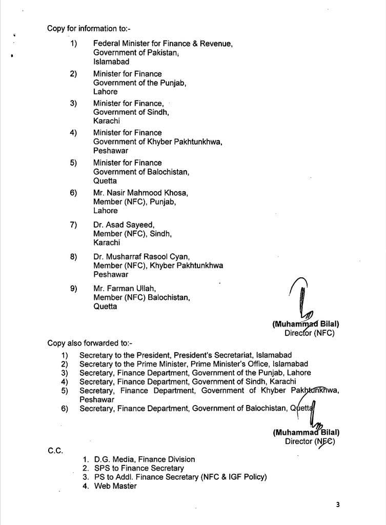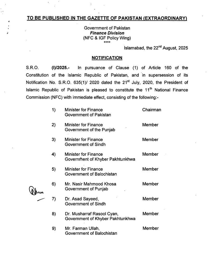 فنانس ڈویژن حکومت پاکستان کی طرف سے گزٹ نوٹیفکیشن جاری کیا گیا ہے۔وزیر خزانہ نیشنل فنانس کمیشن کے چیئرمین ہیں۔حکومت سندھ اور خیبرپختونخوا کی طرف سے وفاقی حکومت کو گزٹ نوٹیفکیشن جاری کرنے کے لئے رضامند کیا گیا۔کے پی کے حکومت کے ترجمان کے مطابق وزیراعلیٰ خیبرپختونخوا علی امین خان گنڈاپور کی انتھک کوششوں سے 11ویں این ایف سی ایوارڈ کا نوٹیفکیشن باضابطہ جاری کردیا گیا ہے۔