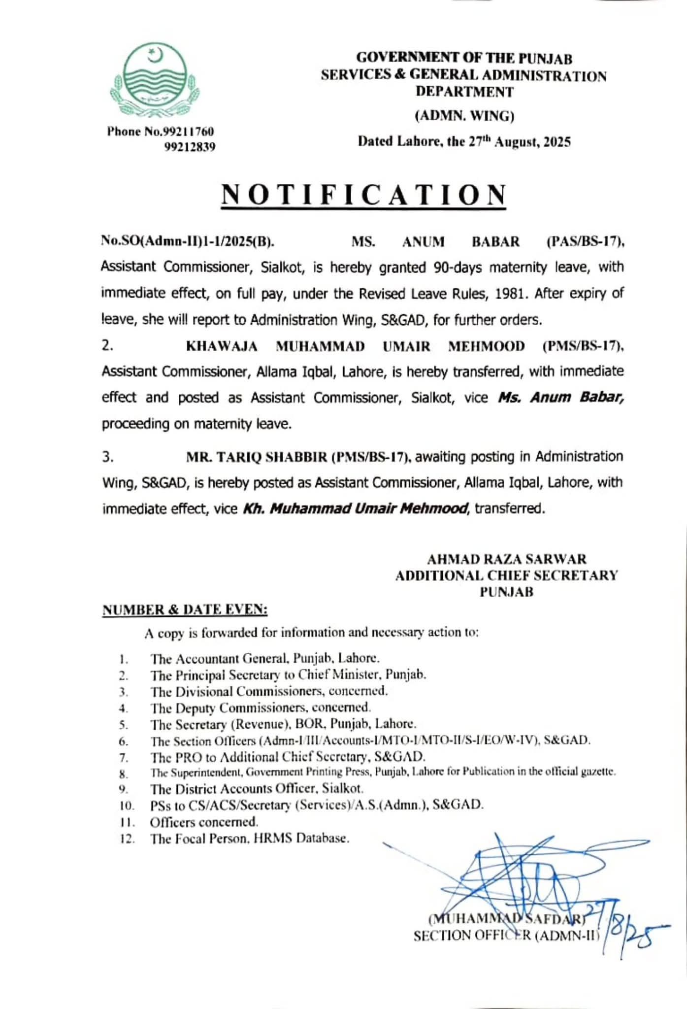 چیف سیکریٹری پنجاب کی منظوری کے بعد نوٹیفیکیشن جاری کر دیا گیا ہے