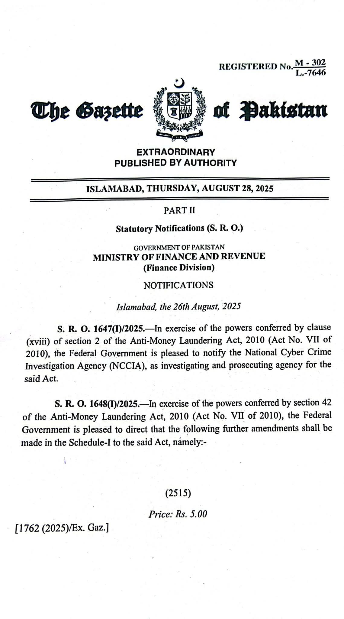 نیشنل سائبر کرائم انویسٹی گیشن ایجنسی اینٹی منی لانڈرنگ کیسز کی تفتیش اور پراسیکیوشن کرے گی۔اینٹی منی لانڈرنگ ایکٹ 2010 میں اہم ترامیم کر دی گئی ہیں۔