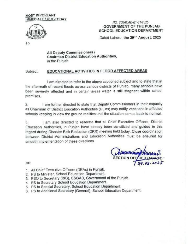 سکول بند کرنے یا کھولنے کے اختیارات اپنے اضلاع میں سیلابی صورتحال کو دیکھتے ہوئے ڈپٹی کمشنرز کو دے دیئے گئے ہیں۔ سیلابی صورتحال کو مدنظر رکھتے ہوئے سکولوں کی بندش کو برقرار رکھنا ہے یا کھولنا ہے اس کا فیصلہ ڈپٹی کمشنرز کریں گے۔