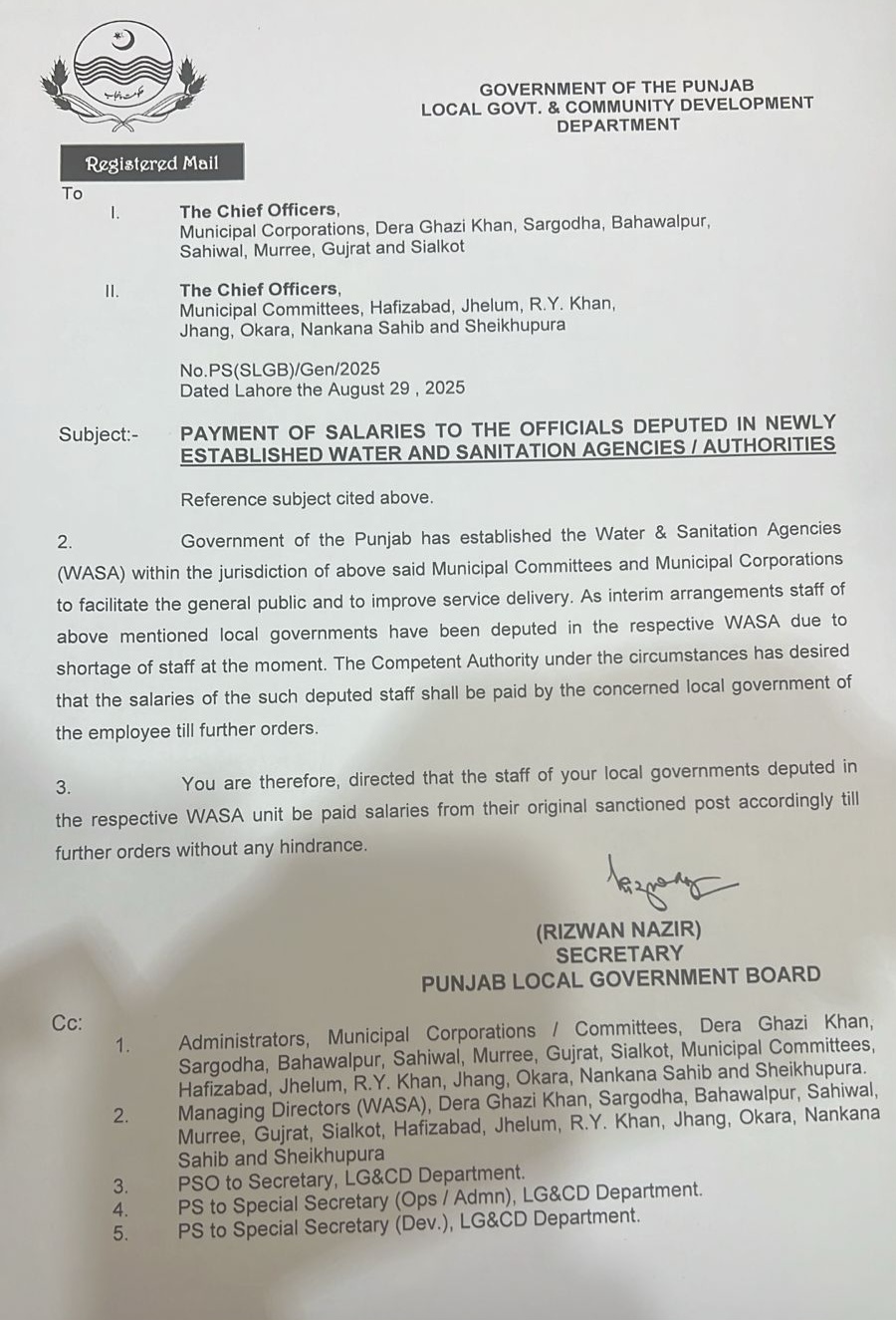 کم دستیاب عملے کے پیش نظر متعلقہ ایم سیز کے ملازمین نئی واسا ایجنسیوں میں تعینات کئے گئے۔متعلقہ ایم سیز کے ملازمین تا حکم ثانی اپنی موجودہ آسامیوں کے مطابق ہی بلا تعطل تنخواہیں لیتے رہیں گے۔ڈی جی خان، سرگودھا، بہاولپور، ساہیوال، مری، گجرات اور سیالکوٹ کی میونسپل کارپوریشن کے چیف آفیسرز کے نام مراسلہ جاری کیا گیا ہے۔حافظ آباد، جہلم، رحیم یار خان، جھنگ، اوکاڑہ، ننکانہ صاحب اور شیخوپورہ کی میونسپل کمیٹیوں کے چیف آفیسرز کے نام بھی مراسلہ جاری کیا گیا ہے۔