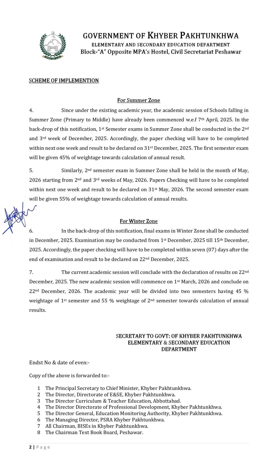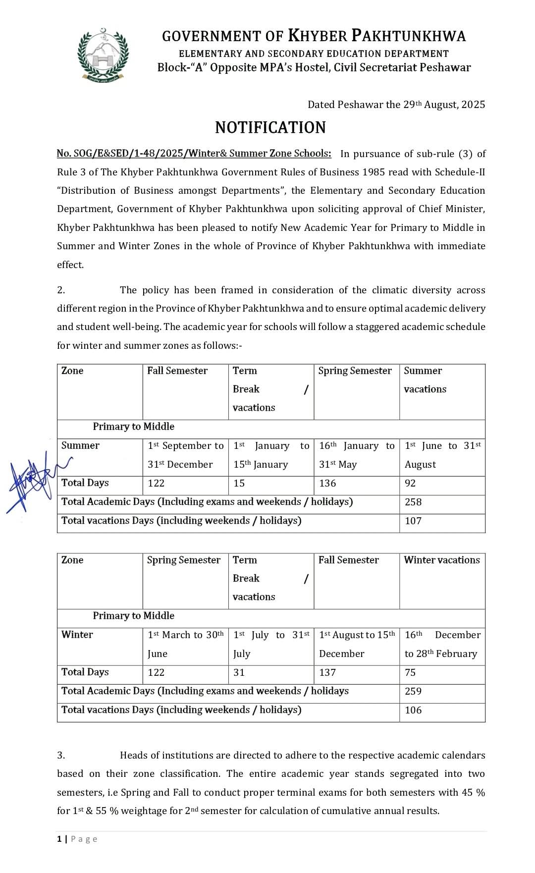 اب صوبے کے پرائمری تا مڈل اسکولوں کے لیے سمر اور ونٹر زونز کے حساب سے الگ الگ تعلیمی سال ہوں گے۔ اس پالیسی کا مقصد طلبہ کی فلاح و بہبود، معیاری تدریسی عمل اور صوبے کے مختلف موسمی حالات کو مدنظر رکھتے ہوئے بہتر تعلیمی ماحول فراہم کرنا ہے۔ نئے نظام کے مطابق امتحانات دو سمسٹرز پر مشتمل ہوں گے، پہلے سمسٹر کو سالانہ نتیجے میں 45 فیصد اور دوسرے سمسٹر کو 55 فیصد وزن دیا جائے گا۔ سمر زون میں امتحانات دسمبر اور مئی میں جبکہ ونٹر زون میں دسمبر میں منعقد ہوں گے۔ یہ فیصلہ تعلیمی معیار میں بہتری اور بچوں کے لیے زیادہ سہولت پیدا کرنے کی جانب ایک اہم قدم ہے۔