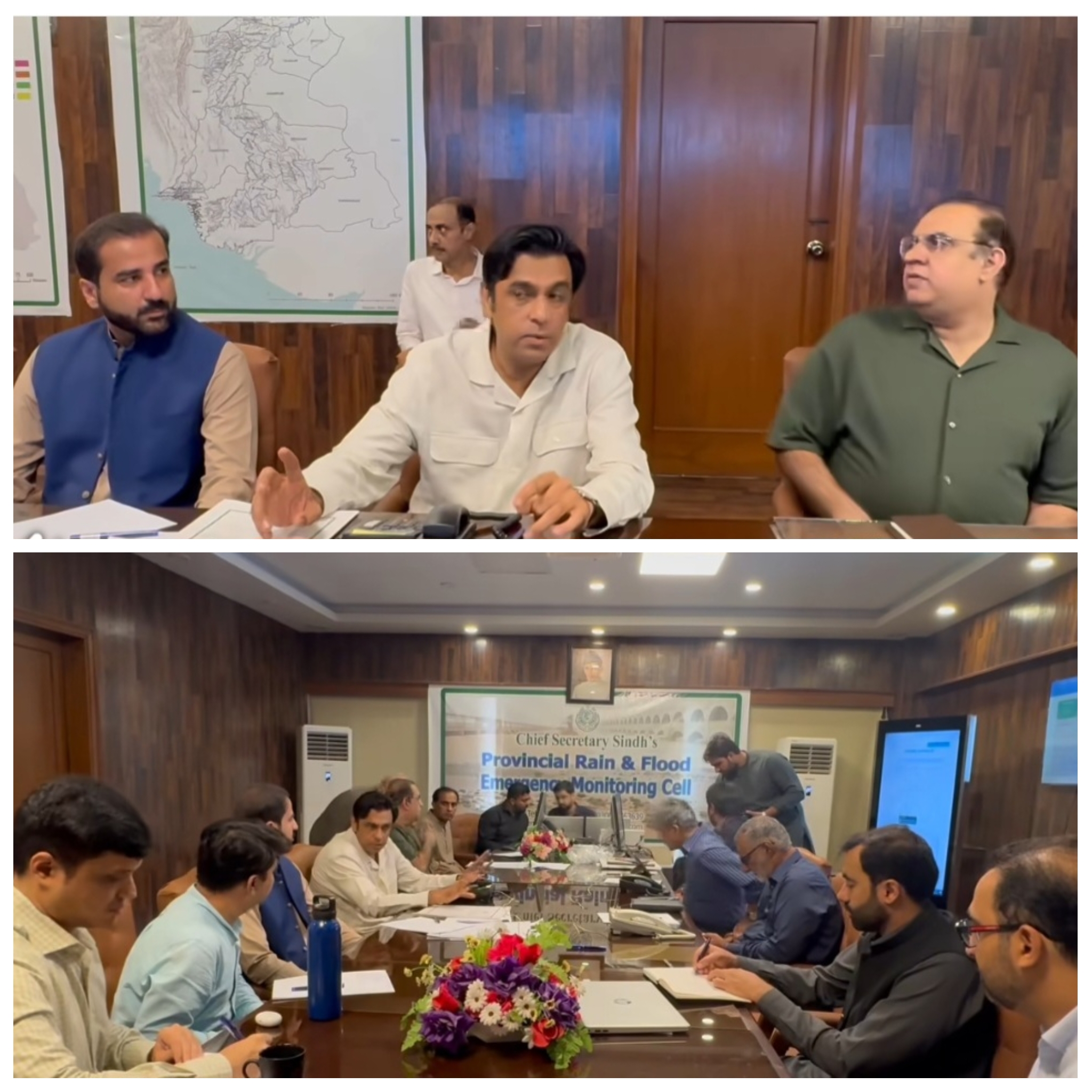 *چیف سیکریٹری سندھ آصف حیدر شاہ کا صوبائی فلڈ کنٹرول روم کا دورہ*کنٹرول روم انچارج کی چیف سیکریٹری سندھ کو سیلابی صورتحال کے متعلق بریفنگ دی گئی۔کنٹرول روم میں سندھ حکومت کے ترجمان مصطفی عبداللہ بلوچ، سیکریٹری انوائرمینٹ اور سیکریٹری جنرل ایڈمنٹریشن سمیت متعلقہ محکوں کے نمائندے بھی موجود تھے۔ گڈو سے سیلابی ریلا 3 ستمبر کو گزرے گا۔ چیف سیکریٹری سندھ کو آگاہی دی گئی کہ اس وقت گڈو بیراج اپ اسٹریم میں 389298 اور ڈاؤن اسٹریم میں 356942 کیوسک پانی کا بہاوء ہے سکھر میں اپ اسٹریم میں 315272، اور ڈاؤن اسٹریم میں 260512 کیوسک پانی کا بہاوء ہے کوٹری پر اپ اسٹریم 262668 اور ڈاؤن اسٹریم 230212 کیوسک پانی کا بہاوء ہے۔*پی ڈی ایم اے** نے آگاہی دی۔پی ڈی ایم اے کے گوداموں میں 2 لاکھ 68 ہزار خیمے، 2 لاکھ 78 ہزار کمبل اور ہزاروں ریسکیو بوٹس و دیگر سامان اسٹاک میں موجود ہے۔ آگاہی پی ڈی ایم اے کے کراچی، جامشورو اور سکھر گوداموں میں 18 لاکھ مچھر دانیاں دستیاب ہیں۔ آگاہی پی ڈی ایم اے کے پاس 9,950 فرسٹ ایڈ کٹس اور 68 ہسپتال ٹینٹ موجود ہیں۔ *محکمہ صحت* محکمہ صحت نے سانپ کے کاٹے کی دوا، ریبیز ویکسین اور دیگر ضروری ادویات کی فراہمی تیز کر دی ہے۔ دور دراز علاقوں میں موبائل ہیلتھ ٹیمیں تعینات، موقع پر ویکسینیشن پوائنٹس بھی قائم کیے جا رہے ہیں۔*محکمہ لائیو اسٹاک* محکمہ لائیو اسٹاک نے صوبے بھر میں جانوروں کی ویکسینیشن کے لیے 300 کیمپس قائم کر دیے ہیں۔ مجموعی طور پر 87,677 جانوروں کا علاج کیا گیا ہے، تمام اضلاع میں طبی ٹیمیں الرٹ پر ہیں۔ جانوروں کی 1,66,817 ڈی ورمنگ کی گئی، تمام موبائل ویٹرنری ٹیمیں فیلڈ میں موجود ہیں۔ محکمہ لائیو اسٹاک کے مطابق ویکسین اور ادویات کا ذخیرہ مطلوبہ مقدار میں موجود ہے۔ ریسکیو 1122 کو ہائی الرٹ پر رکھا گیا ہے، خطرے کے شکار اضلاع میں ٹیموں اور سامان کی تعیناتی شروع۔ متاثرہ علاقوں میں موبائل ہسپتال اور موبائل ویکسینیشن یونٹس بھی تعینات کیے جا رہے ہیں۔کمیٹی روم میں درج ذیل ٹیلیفون نمبر نصب کیے گئے ہیں، جن پر کنٹرول روم سے رابطہ کیا جا سکتا ہے:, 02199222902 , 0219922296702199222758, 02199222758