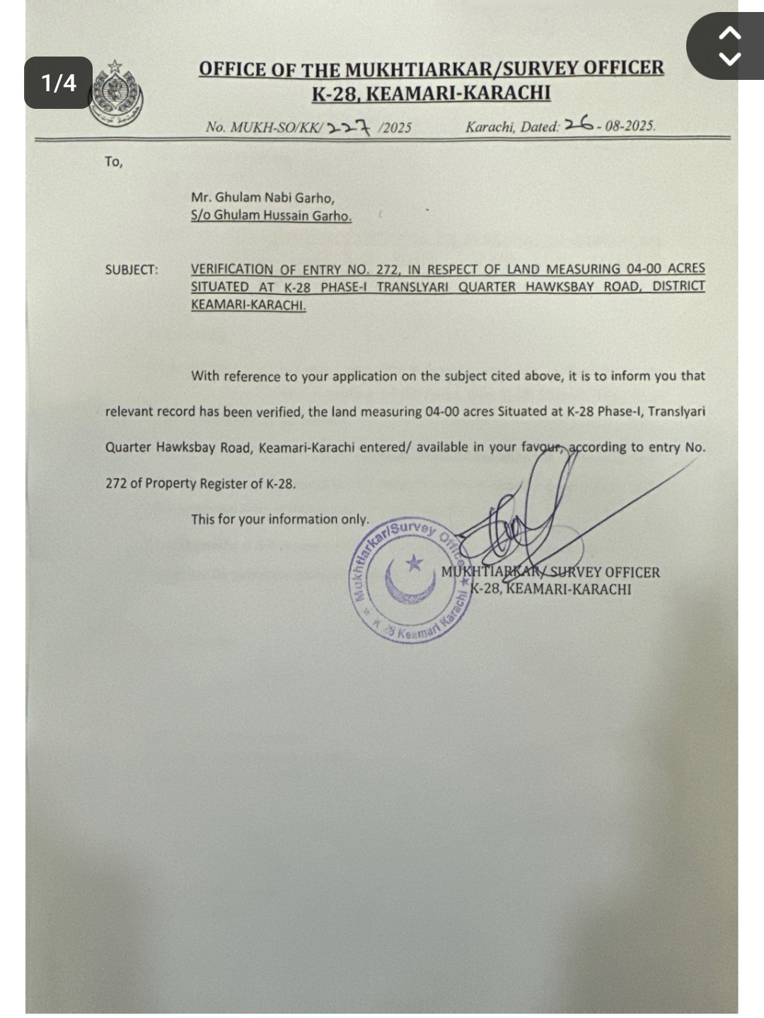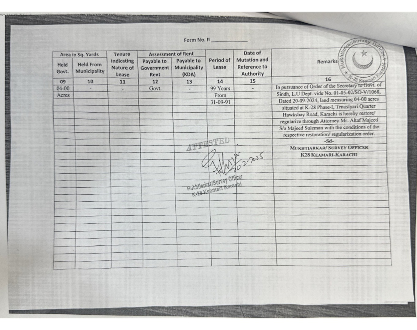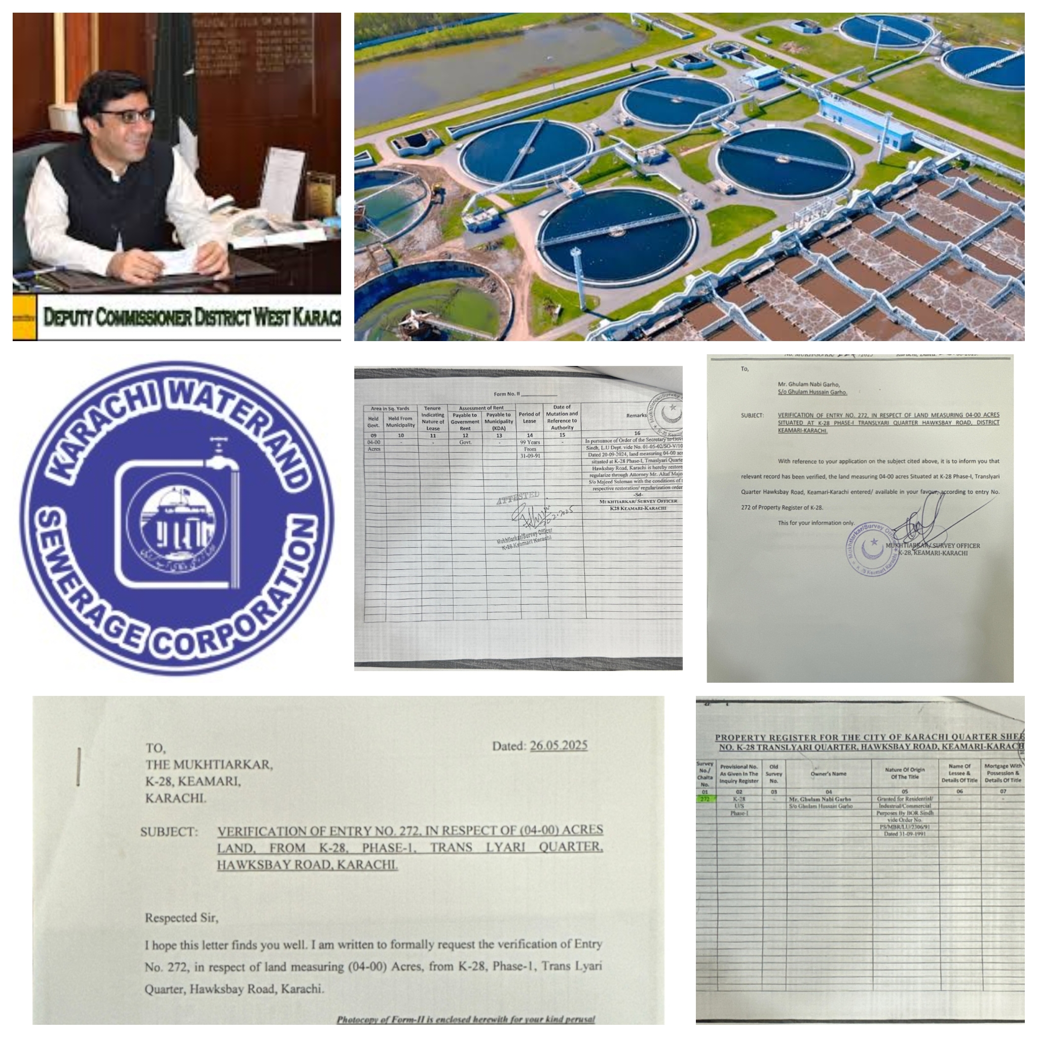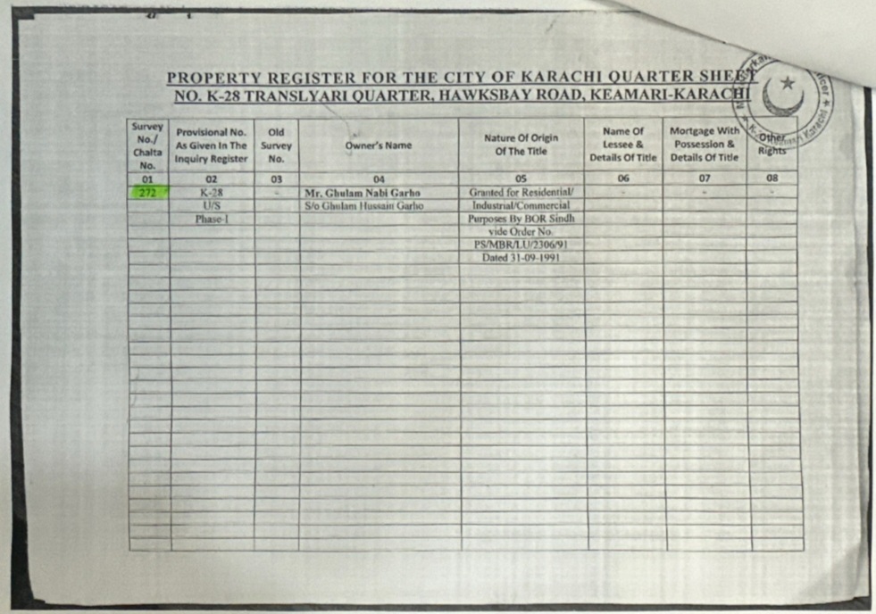 حالیہ قبضے کے دوران بھی تمام کاغذات پیش کیئے گئے تھے،جس پر متعد د بار جعلی دستاویزات پر قبضہ کرنے کی کوشش ہوچکی ہے جسے واٹر کارپوریشن نے ہمیشہ ناکام بنا دیا تھا۔ مبینہ طور پر ڈپٹی کمشنر کیماڑی راجہ طارق چانڈیو کی جانب سے زمین الاٹمنٹ پیش کی گئی اور وہی قبضہ دلانے کے لئے واٹر کارپوریشن پر دباؤ ڈال رہے ہیں۔ ذرائع کا کہنا ہے کہ ڈپٹی کمشنر کیماڑی کی ہدایت پر ریکارڈ آف رائٹس میں اندارج، فارم ٹو اور NOC جعلی جاری کی گئی۔اس بارے میں پروجیکٹ ڈائریکٹر ایس تھری پروجیکٹ نے تصدیق کردی ہے۔ مختیار کار کیماڑی نے خط نمبر MU/KH-SO/KK/227/2025 بتاریخ 26 اگست 2025ء کو جاری کیا تھا اور غلام نبی گھاہو ولد غلام حسین گھاہو انٹری نمبر 272،چار ایکٹر اراضی مقام K-28 فیز ٹرانس لیاری ہاکس بے روڈ ضلع کیماڑی کراچی میں الاٹ کردیا گیا، جعلی درخواست گزار کا ریکارڈ آف رائٹس میں اندراج کیا ہے اور درست ریکارڈ قرار دیا گیا ہے۔ دلچسپ امر یہ ہے کہ مختیار کار نے اپنی رپورٹ میں زمین کی حیثیت کا تعین نہیں کیا بلکہ رہائشی، کمرشل، انڈسٹریل کا فارم ٹو جاری کیا ہے۔ اپنے حکمنامہ میں بورڈ آف ریونیو کا یہ حکمنامہ جعلی کاغذات پر جاری کیا اس پلاٹ کی لیز پہلے اور الاٹمنٹ بعد میں جاری کیا گیا تھا جس کا دستاویزات میں NO,PS/MBR/LU/2306/91 بتاریخ 31 اگست 1991ء کو سرکاری زمین کی لیز اور لینڈ یوٹیلائیزیشن کے سیکریٹری کا خط نمبر NO.01-05-02/SO-V/1068 بتاریخ 20 ستمبر 2024ء میں الاٹمنٹ جاری کیا۔ درخواست گزار کا جھوٹ ثابت ہونے کے باوجود ڈپٹی کمشنر کیماڑی راجہ طارق چانڈیو کی ہدایت پر جعلی، دھوکہ دہی،فراڈ اور مجرمانہ اقدام پر فوجداری مقدمات درج کیا جانا چاہیے تھا تاہم ڈپٹی کمشنر کیماڑی نے جعل ساز درخواست گزار نے معرفت الطاف مجاہد ولد مجید سلمان جمع کرائی تھی اور مختیار کار کیماڑی نے 20 فروری 2025ء کو تصدیق کے بعد جاری کیا تھا جب کہ ان کے علم میں تھا کہ سب فراڈ ہے۔ یہ درخواست غلام نبی گھاہو نے 26 مئی 2025ء کو ڈپٹی کمشنر کیماڑی راجہ طارق چانڈیو کو دی تھی،ڈپٹی کمشنر کیماڑی کی نگرانی میں ہاکس بے میں واقع ٹریٹمنٹ پلانٹ تھری واٹر کارپوریشن کی زمین پر قبضہ کی کوشش ناکام ہوچکی ہے۔ مبینہ طور پر ڈپٹی کمشنر کیماڑی راجہ طارق چانڈیو نے قابضین کے خلاف کاروائی اور ایف آئی آر درج کرنے سے روک دیا تھا اور پروجیکٹ ڈائریکٹر ایس تھری نظام الدین شیخ کو فون پر قبضہ گروپ قرار دیتے ہوئے کہا ہے کہ آپ کو دیواریں نہیں گرانی چاہیے اور ازخود کاروائی نہیں کرنا چاہیے تھی۔ آپ اپنے کاغذات بروز پیر 26 مئی کو ڈپٹی کمشنر کیماڑی لیکر پہنچ جائیں۔کارپوریشن کے ذرائع کا کہنا ہے کہ جمعہ کی درمیانی شب کو ٹریٹمنٹ پلانٹ تھری کے مغربی حصے میں زمین پر قبضہ کرتے ہوئے تعمیرات شروع کردی گئی۔ کروڑوں روپے مالیت کی چار ایکٹر اراضی پر چار دیواری کی تعمیرات تیزی جاری تھی کہ اطلاع ملتے ہی پروجیکٹ ڈائریکٹر ایس تھری نظام الدین شیخ موقع پر پہنچ گئے اور کارپوریشن کے انتظامیہ اور سی ایف او کے ساتھ پولیس کو اطلاع دی جو موقع پر پہنچ گئی۔ کارپوریشن کے چیف ایگزیکٹو آفیسر احمد علی صدیقی کی ہدایت پر فوری طور پر دیواریں منہدم کر دی گئیں اور کارپوریشن حکام نے ایس ایس پی کیماڑی، ڈپٹی کمشنر کیماڑی کو اگاہ کیا کہ ٹریٹمنٹ پلانٹ تھری ہاکس بے کی زمین پر قبضہ کی متعدد بار کوشش ہوچکی ہے۔ ذرائع کا کہنا ہے کہ نئی قبضہ کوشش میں سیاسی شخصیت آسکانی کا نام لیا جارہا ہے، قابضین مقامی افراد تھے جو پہلے ہی قبضے کی زمین پر رہائش پذیر ہیں۔مصدقہ ذرائع کا کہنا ہے کہ زمین پر قبضہ کی کوشش ایک بار پھر ہونے کا امکان موجود ہے، قابضین نے دعوی کیا تھا ان کے پاس موروثی زمین کے کاغذات موجود ہیں۔ بورڈ آف ریونیو نے اس زمین کے کاغذات کی جانچ پڑتال کی ہے تاہم کارپوریشن حکام نے کاغذات مانگنے اور طلب کرنے پر انہیں دکھائے تھے۔ اور وہ ڈپٹی کمشنر کیماڑی کو پیش کریں گے۔ موقع پر موجود پولیس نے قابضین کو آج شام تک کاغذات کی کاپی پیش کرنے کی ہدایت کی ہے۔ اسسٹنٹ کمشنر ماڑی پور غلام محی الدین کو بھی اطلاع دی
