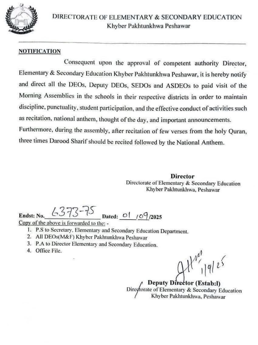 ترجمان خیبرپختونخوا حکومت عمران خان کے خواب کے عین مطابق ریاست مدینہ طرز عمل اپناتے ہوئے خیبر پختونخوا حکومت نے صوبہ بھر کے سکولوں کی اسمبلی میں تلاوت قرآن پاک اور قومی ترانے کے بعد تین مرتبہ درود شریف محکمہ تعلیم خیبرپختونخوا نے لازمی قرار دیدیا!!اس سلسلہ میں باقاعدہ نوٹیفیکشن جاری کر دیا گیا ہے