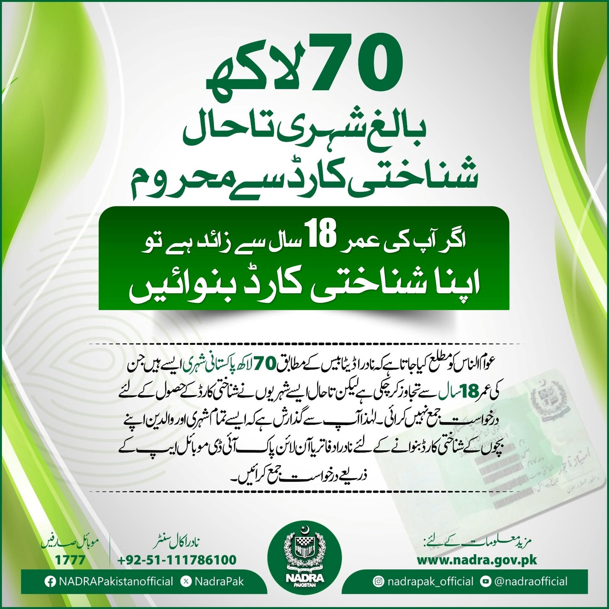 نادرا نے اپنے اعلامیہ میں کہا ہے کہ اگر آپ کی عمر 18 سال سے زائد ہے تو اپنا شناختی کارڈ بنوائیںعوام الناس کو مطلع کیا جاتا ہے کہ نادرا ڈیٹابیس کے مطابق 70 لاکھ پاکستانی شہری ایسے ہیں جن کی عمر 18 سال سے تجاوز کر چکی ہے لیکن تاحال ایسے شہریوں نے شناختی کارڈ کے حصول کے لئے درخواست جمع نہیں کرائی۔لہٰذا آپ سے گذارش ہے کہ ایسے تمام شہری اور والدین اپنے بچوں کے شناختی کارڈ بنوانے کے لئے نادرا دفاتر یا آن لائن پاک آئی ڈی موبائل ایپ کے ذریعے درخواست جمع کرائیں۔