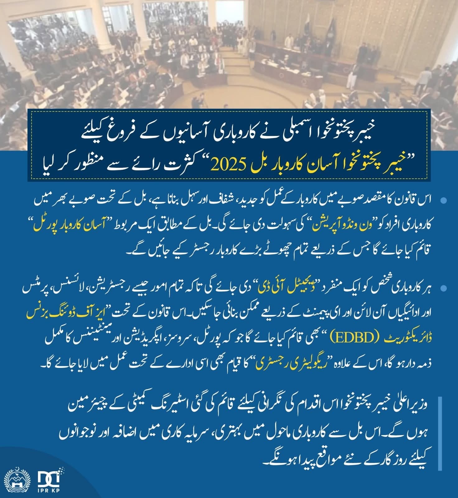 •اس قانون کا مقصد صوبے میں کاروبار کے عمل کو جدید، شفاف اور سہل بنانا ہے، بل کے تحت صوبے بھر میں کاروباری افراد کو “ون ونڈو آپریشن” کی سہولت دی جائے گی۔ بل کے مطابق ایک مربوط ”آسان کاروبار پورٹل“ قائم کیا جائے گا جس کے ذریعے تمام چھوٹے بڑے کاروبار رجسٹر کیے جائیں گے۔