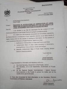 صوبہ پنجاب میں مقامی حکومتوں کے انتخابات کے انعقاد کے لیے مقامی علاقوں کی حد بندی اور تصدیق شدہ نقشے وغیرہ کی اطلاع کی فراہمی