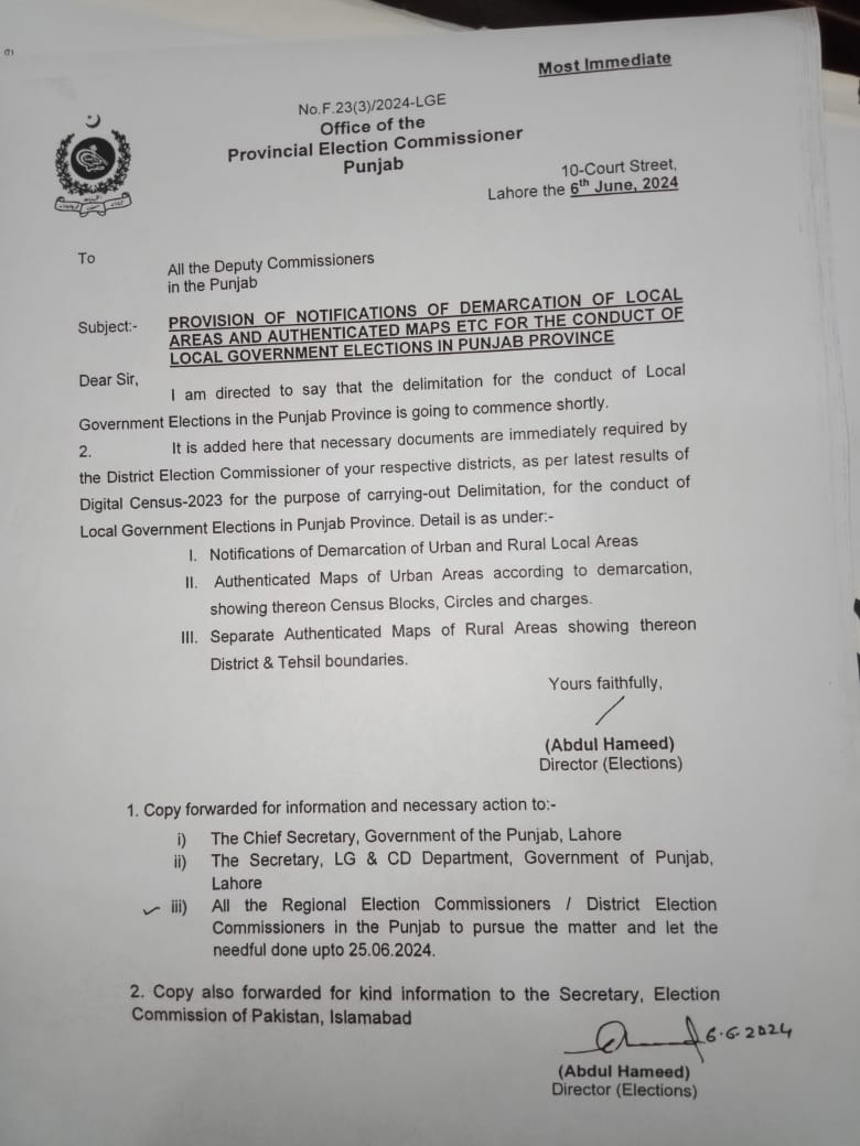 2. یہاں یہ شامل کیا جاتا ہے کہ صوبہ پنجاب میں بلدیاتی انتخابات کے انعقاد کے لیے، حد بندی کرنے کے مقصد کے لیے، ڈیجیٹل مردم شماری-2023 کے تازہ ترین نتائج کے مطابق، آپ کے متعلقہ اضلاع کے ڈسٹرکٹ الیکشن کمشنر کو فوری طور پر ضروری دستاویزات درکار ہیں۔ . تفصیل حسب ذیل ہے۔